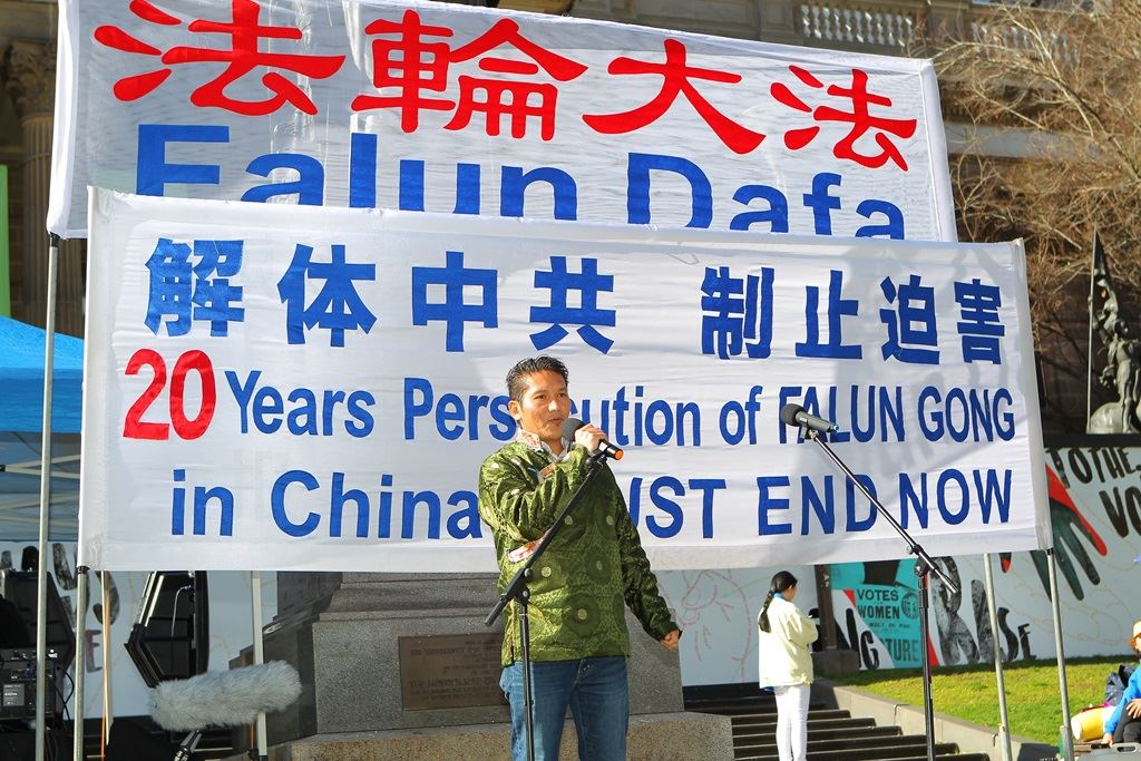 维州法轮大法学会会长樊慧强先生在集会中表示,中共对法轮功学员的迫害遍及全中国,数万人被判劳教、关进精神病院,受到强制洗脑等各种形式的迫害。“明慧网数据显示,在2019年上半年,超过两千名法轮功学员被捕,其中至少335人被判刑,此外,还有更多法轮功学员受到反复骚扰”。