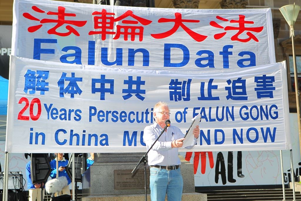墨尔本《天安门时报》主编阮杰先生在发言中说:“二十年来,法轮功学员们坚持不懈地为信仰自由、为停止迫害进行抗争。而他们的抗争不仅仅是为了他们,而是为你,为我,为所有的人。”