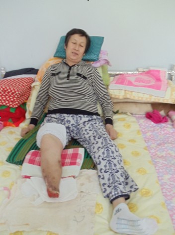 宋会兰被打毒针迫害后,腿脚变黑、小腿腐烂。(明慧网)