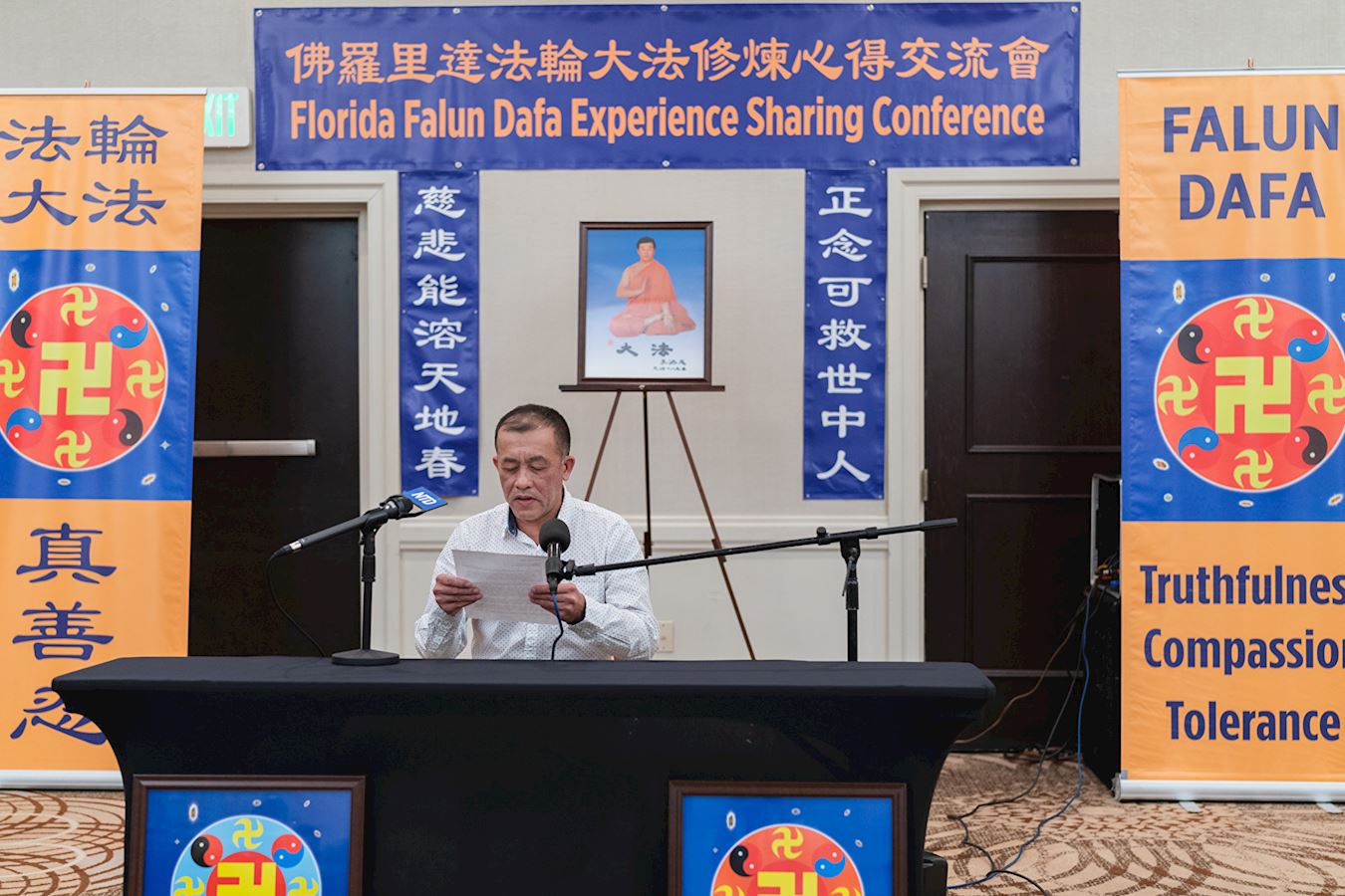 ![]() 图8:Nhut Nguyen在佛州法会上交流了自己的修炼体会。 |