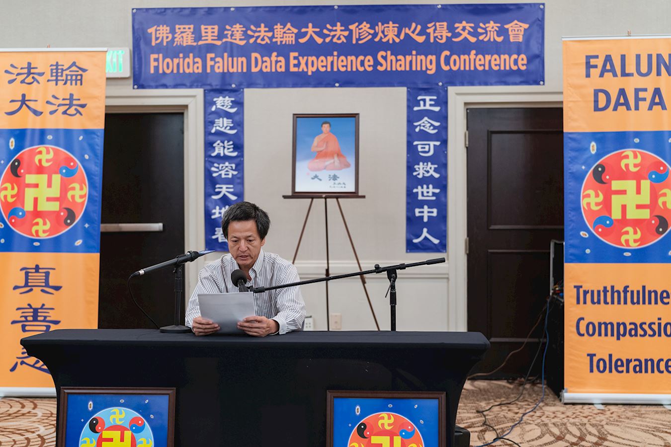 ![]() 图9:梁阿康在佛州法会上交流了自己的修炼体会。 |