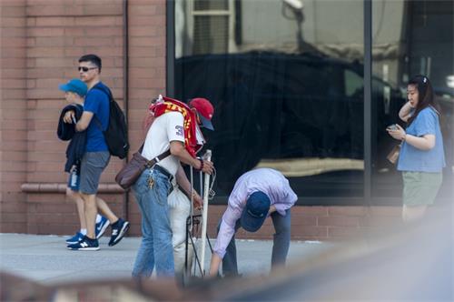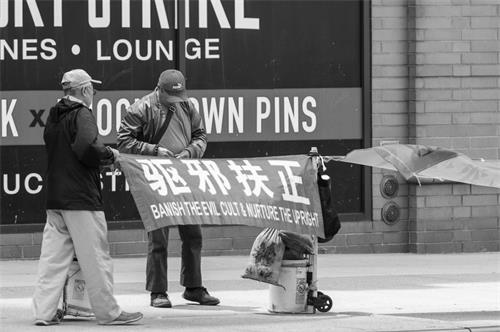 当初,他们在法轮功学员的横幅旁边摆出诬蔑法轮功的横幅,还散发抹黑法轮功的传单。一些过往人士不明就里,接拿了诬蔑传单,但听了旁边的法轮功学员讲述真相后,就把诬蔑传单交给了学员,并从法轮功学员手里接过了真相传单。当时摆放诬蔑横幅者其中之一的是一名年轻华人男子。他看到这种情景,曾立即冲过来大骂法轮功学员,并动手推搡发真相传单的法轮功学员黄女士。