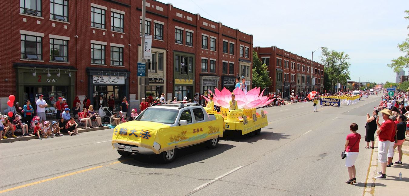 当天上午十一点,天国乐团、花车和炼功队参加了在密西沙加市(Mississauga)的国庆游行;下午四点天国乐团和花车参加了士嘉堡市(Scarborough)的国庆游行;傍晚七点腰鼓队和炼功队开车两小时到斯特拉特福市(Stratford)参加了当地的国庆游行。所到之处都受到当地民众的热烈欢迎。