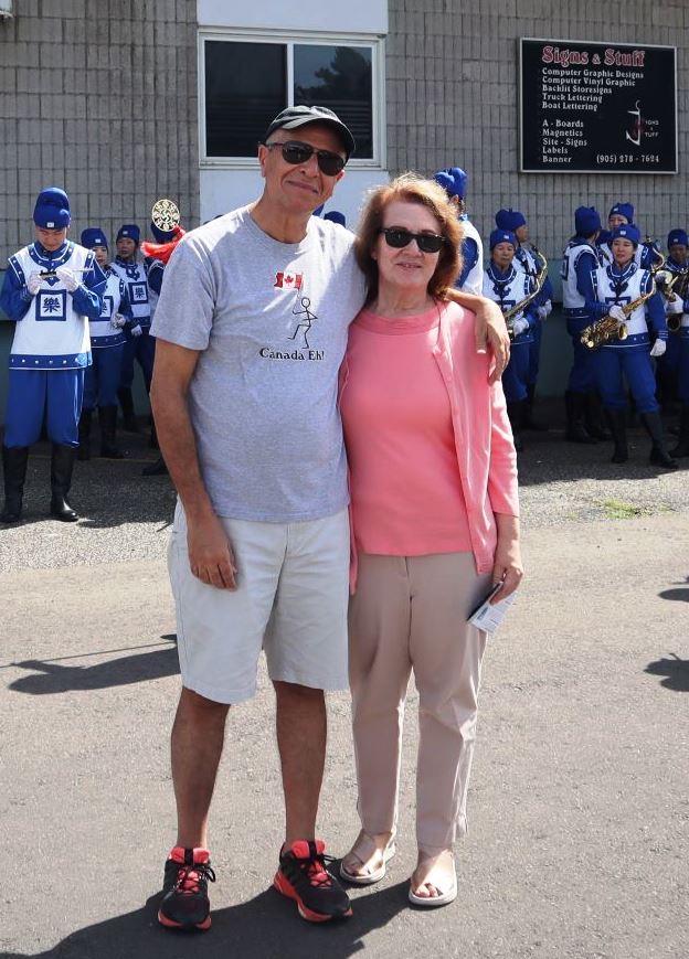 图12:在密西沙加的游行中,贝尔(BAN)女士和先生一直在为天国乐团拍照,她说:“我是第一次看到天国乐团的演奏,真的是太棒了。”她说自己是第一次听到法轮功,学员就向她介绍了法轮功的五套功法、《转法轮》,以及法轮功是按“真、善、忍”原则修炼的,并把法轮大法的官方网站介绍给她。她表示回去会再详细地了解。最后她还要了密西沙加炼功点的联系方式。
