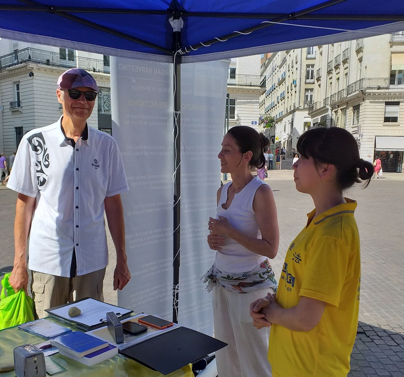 【明慧网二零一九年七月六日】2019年6月29日,法轮功学员在法国西部城市南特的“皇家广场”举办活动,向市民介绍法轮大法(又称法轮功)的美好,同时,揭露中共迫害法轮功及强行活摘法轮功学员器官的罪恶。