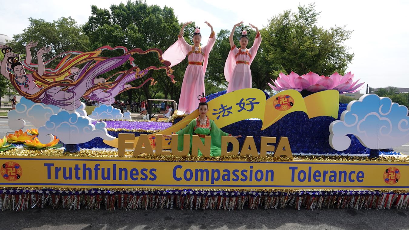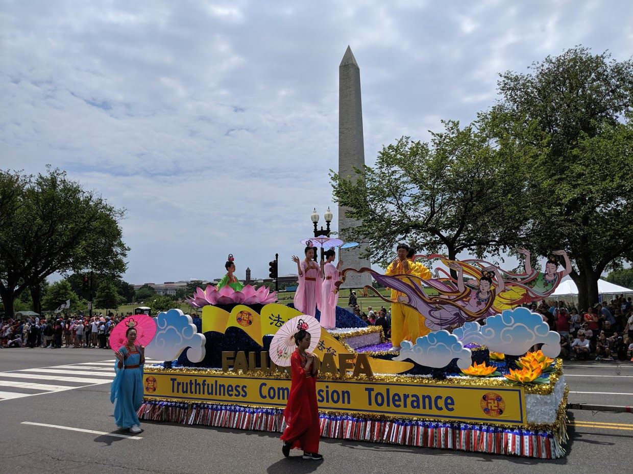 天国乐团连续十四年入选,也是唯一受邀参加游行的华人军乐队;法轮功学员设计制作的精美花车在参加游行的九个花车中最为亮眼,“法轮大法好”、“真善忍”镶嵌在花车两侧,车头以蓝天白云和飞天仙女装饰,车尾装饰一朵盛开的莲花,几位青年法轮功学员在花车上展示功法,身着仙女服的女孩与道路两边欢呼的民众挥手互动;另有二十多位法轮功学员受主办方之邀手持生日蛋糕大气球。很多第一次看到法轮大法游行队伍的民众说,法轮功最壮观,让人感动。