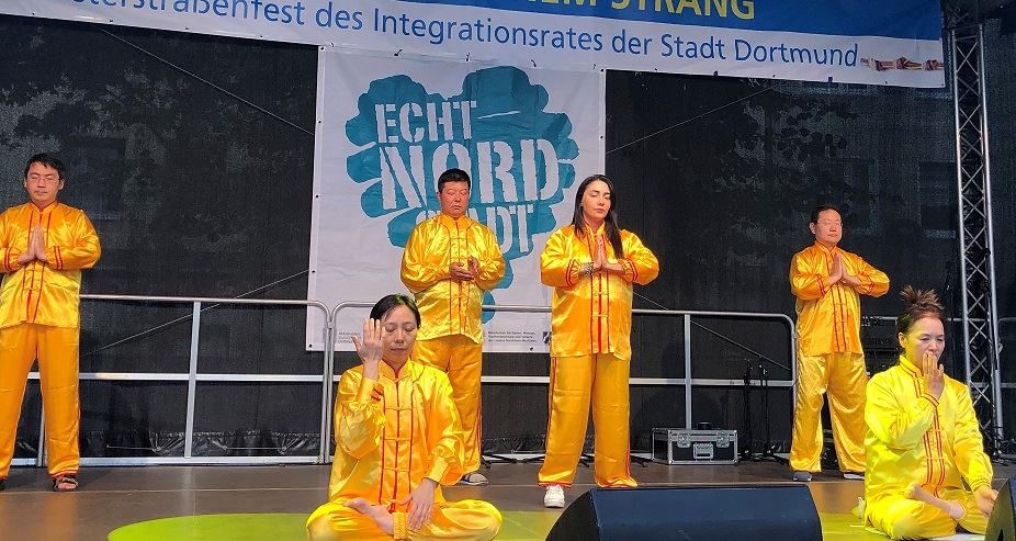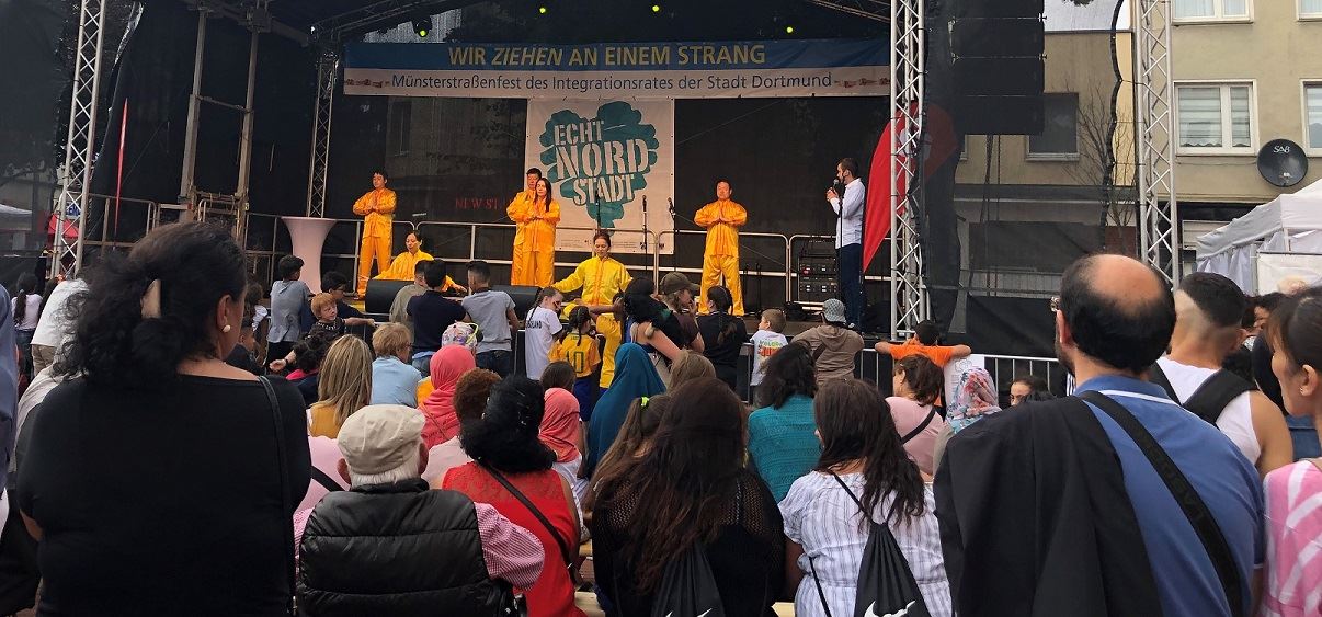 明斯特街会是一个展现不同文化的节日,这天可以在街上看到许多穿着民族服装的游客和参展协会的成员。当法轮功学员们穿着金黄色炼功服出现在舞台上时,观众席上一片掌声。学员们演示法轮功五套功法的同时,一位学员在舞台上用麦克风向民众介绍每套功法的特点,法轮功“真、善、忍”的准则及中共对法轮功长达二十年的迫害。介绍功法时,观众席上坐满了人,许多人不得不站着观看。
