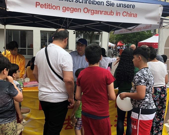 功法演示结束后,一对母女特地来到真相点。那位女儿正在读中学,在学校写过关于人权方面的文章,所以中共对法轮功的迫害引起了她的注意。学员给这对母女介绍了一些相关书籍和调查报告后,她们都对中共的迫害表示震惊,并为反迫害签了名。