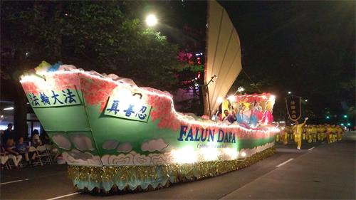 今年约有一百二十多个团体参加了游行,其中法轮功的队伍最吸引人,当法轮功游行队伍经过时,人们欢呼雀跃,有人鼓掌,有人喝彩,更多的人用手机录相、拍照。许许多多的观众跟着花车上炼功的学员比划着炼功动作。观众中有许多华人,他们看到法轮功的团体都非常兴奋。一位华人一看到大法的队伍出现在这么大的公众活动中,惊讶而高兴地大声说:“哇!法轮大法!”三十万现场观众与七十万的电视观众都目睹了法轮功的美好与祥和。