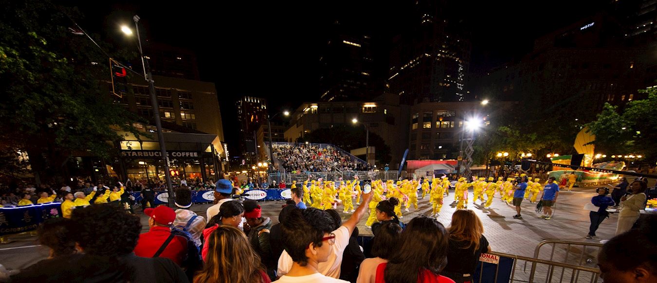 当法轮功学员的游行队伍经过主席台时,Kiro 7电视直播的主持人介绍道:“法轮功,又称法轮大法,是一种古老的性命双修的功法,以真善忍为原则。法轮功有五套简单易学的功法,能使人减轻压力与焦虑,整体提升人们的身体健康,并使人达到内心的平静。这功法太棒了!大家知道吗? 世界上有七十多个国家,一亿人修炼法轮功!”“这艘中国明朝特色的大船照亮了海洋节星光游行的天空,带你驶入神奇的神州!这些身着传统服饰的男士女士们正在向观众们表示欢迎。”“这个团体中包容了老少不同的人们。”“请大家看大船的后方,这是中国传统的腰鼓。”“我已经感受到平静了!”
