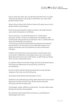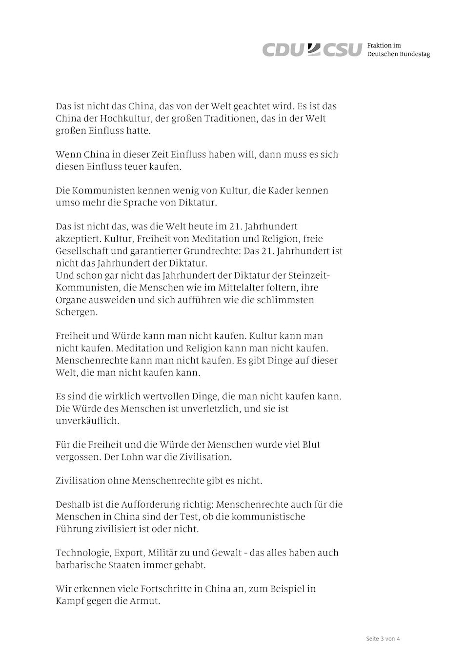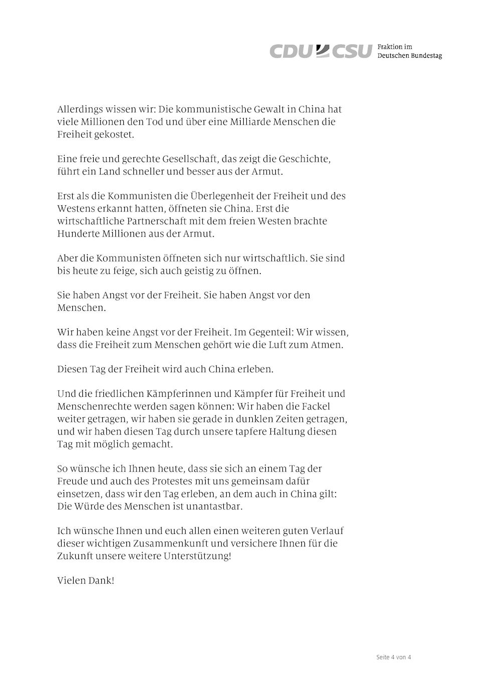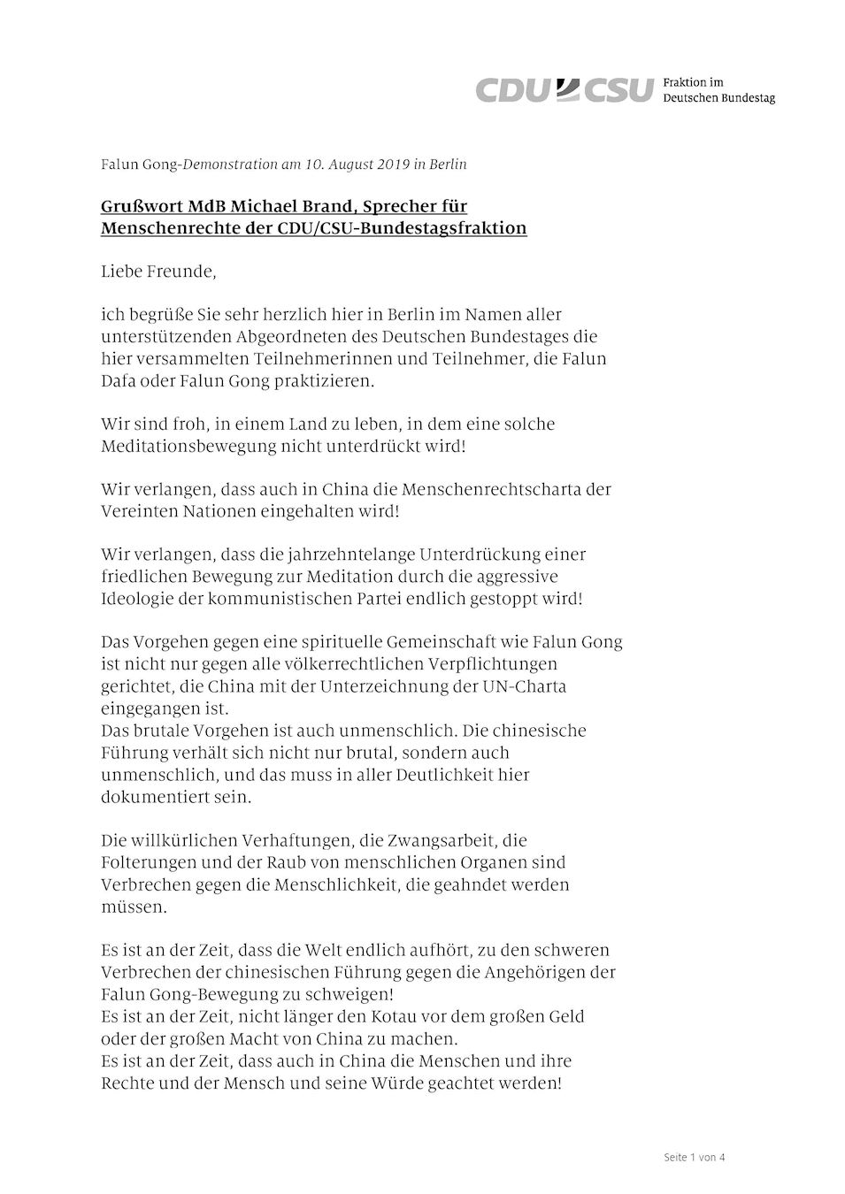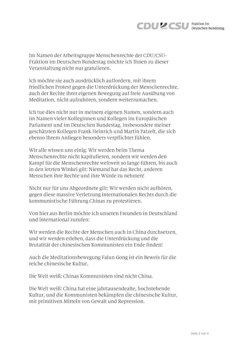 基督教民主联盟人权事务发言人布兰德先生(Michael Brand)首先代表德国联邦议会中所有支持法轮功学员的议员们衷心问候参加活动的法轮功学员。在信中他强烈谴责中共迫害法轮功的反人类罪行:“崇尚暴力的共产主义思想对这个和平打坐的运动已经压迫数十年了,我们要求停止这种压迫!中国是签署了‘联合国宪章’的。对待像法轮功这样的信仰群体的这种做法不仅违反了国际法的义务,这种残酷的做法也是不人道的。中国领导人的行为不仅残酷,而且没有人性。这一点必须清楚的记录在案。任意逮捕,劳改,酷刑迫害和摘取器官,这些都是反人类的罪行,必须受到制裁。现在到时候了,世界不能继续对中国领导人对法轮功学员们的罪行保持沉默了!“