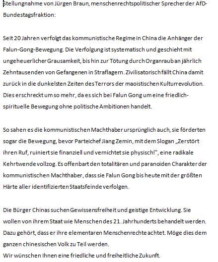 德国选项党AfD国会议员的约根·布朗先生(Juergen Braun)谴责中共把法轮功当作为国家敌人。他写道:“二十年来中共集权迫害法轮功。这场迫害是有系统的,而且残酷至极,上万的被关押法轮功学员被器官活摘致死。中国的文明程度倒退至最黑暗的毛时代的文革时期,更恐怖的是他们迫害的法轮功学员是一个平和的、没有任何政治目的的修炼群体。