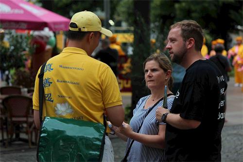 卡特琳娜说:“游行是一个非常好的形式吸引人们的关注。人们会听到音乐,看到讯息,会来看到底发生了什么事情。传单上的信息给出很多资讯,然后能跟法轮功学员交谈,(对法轮功)有很正面的印象,法轮功是对人们有益的。”