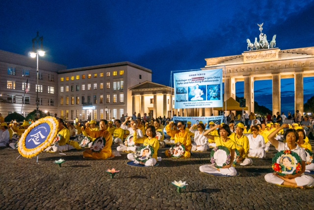 下午两点钟,第二场游行从波兹坦广场(Potsdamer Platz)开始,维滕别格广场(Wittenbergplatz)结束。晚上八点,法轮功学员回到巴黎广场,点上蜡烛,在平和肃穆中悼念被中共迫害致死的大陆法轮功学员,黑夜中人们被温暖的烛光吸引,许多人走上前来默默注视,直到活动结束才带着资料离开。