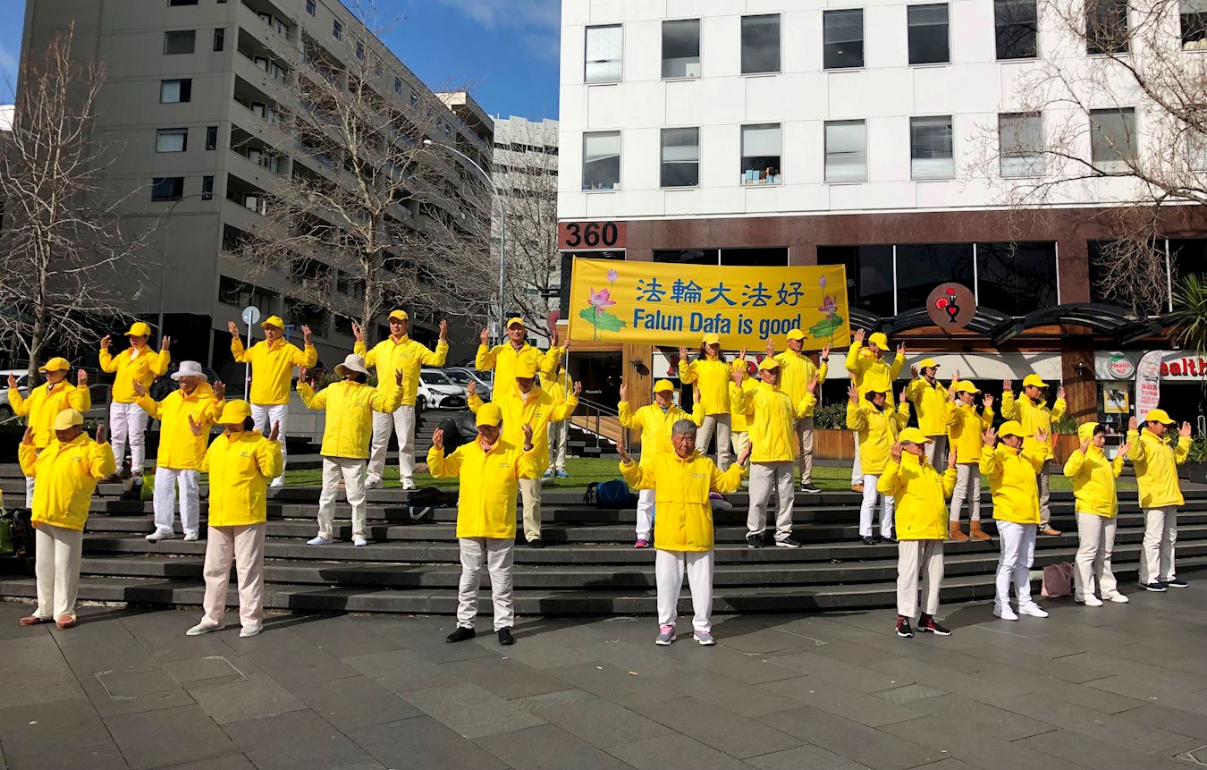 ![]() 图1:法轮功学员在新西兰奥克兰市中心最繁华的皇后街展示功法。 |
