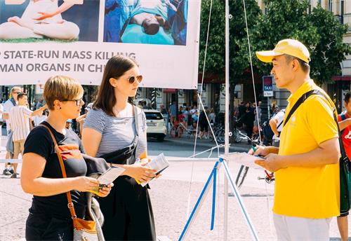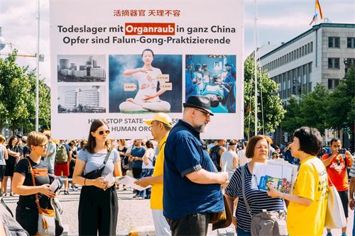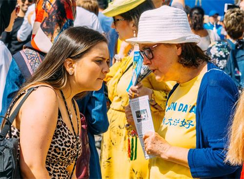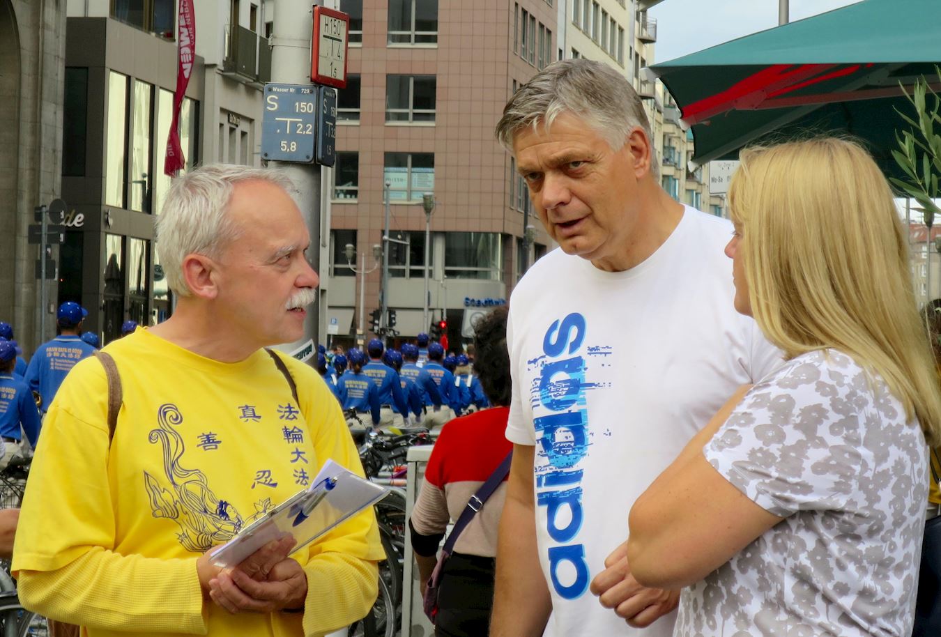 一位带着孩子来德国旅游的上海女士在博物馆里听到的天国乐团的演奏,觉得音乐很好听,很好奇地跑到街上来看。她说,看到这个游行非常震撼,在这里还有这么多人为法轮功呼吁,还有很多外国人在队伍里,感到队伍那么壮大。之后她又跟法轮功学员交谈了一会儿,了解真相。