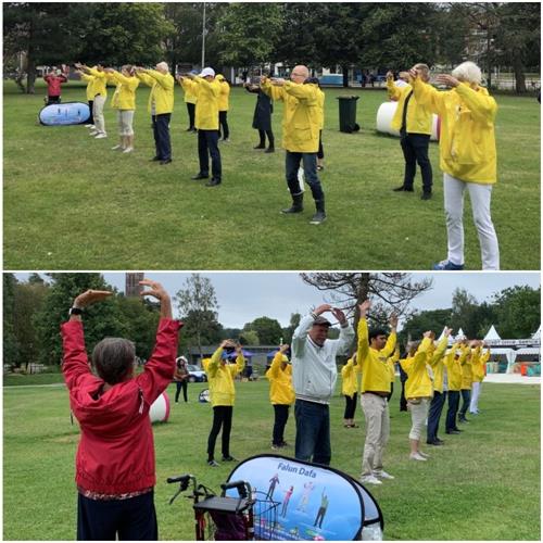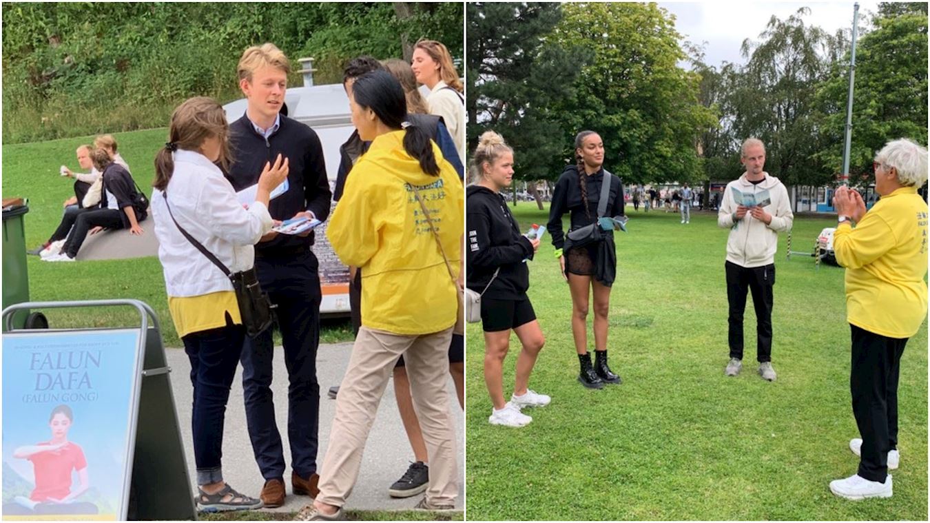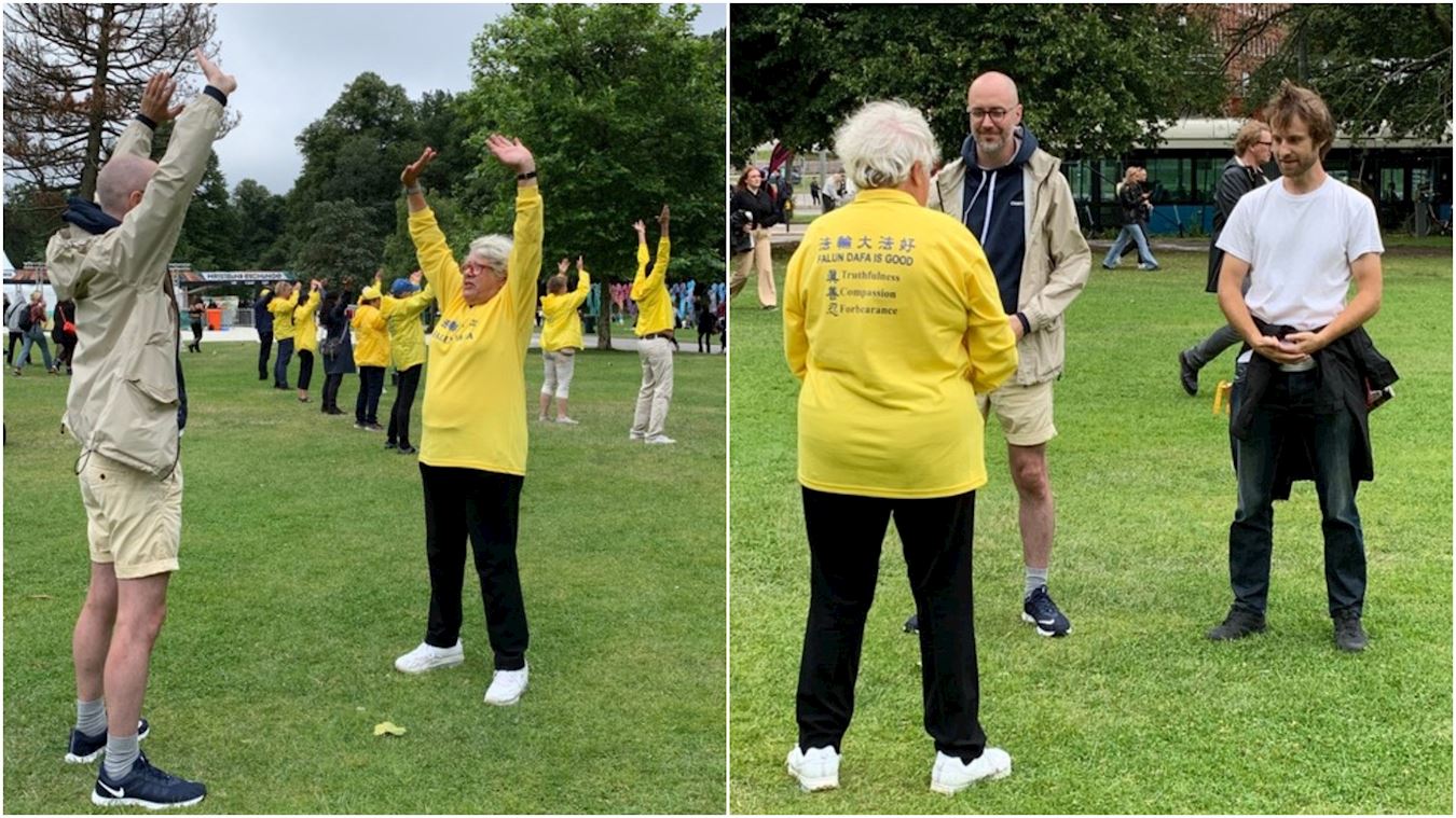 有五个年轻人前来咨询问:这个功法叫什么名字,对人体有什么好处?得知法轮功可以帮助减轻生活和工作中的压力时,五个年轻人每个人都拿了一份资料,并记下了哥德堡德的炼功时间与地点。其中的一位女学生问到:“我也可以让我姥姥一起炼吧?”学员告诉她:“没问题,什么年龄的人都可以炼法轮功。”
