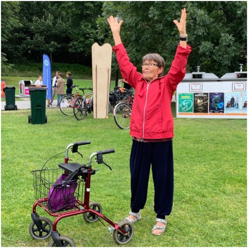 还有一位有缘人,是个身着红色衣服的老奶奶。虽然走路不很方便,但是她每次在大家炼功的时候,都会站在旁边跟着一起炼功。她说:“跟着你们一起炼功,我的身体很舒服。”