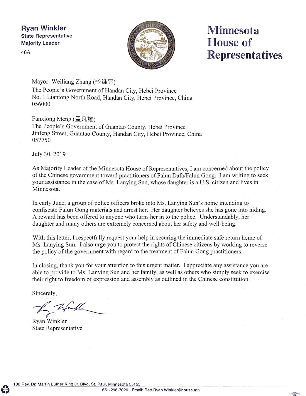 二零一九年七月十六日,美国国会议员迪恩·菲利普斯(Dean Philips)也致信明尼苏达州法轮大法学会。信中,议员感谢明尼苏达州法轮大法学会制止中共迫害的努力,强烈谴责中共强摘器官的罪行,并且密切关注河北省邯郸市馆陶县法轮功学员孙兰英近日被迫害的情况。明尼苏达州立法议员在过去几年一直关注法轮功团体被迫害的情况。作为外交事务委员会的成员,菲利普斯议员会继续调查,并寻求解决方案。
