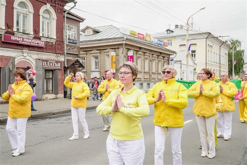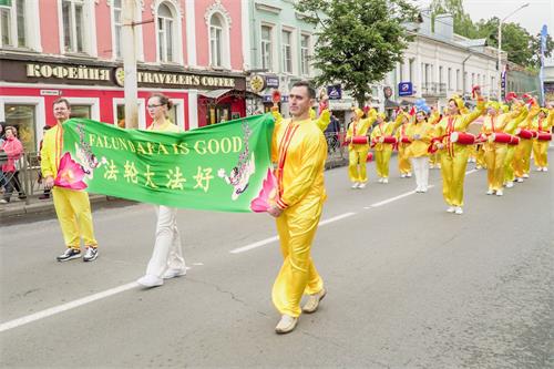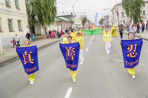 游行队伍到达苏萨宁(Susaninskaya)广场结束,所有的团队都参加了简短的展示,由特别评审团进行评估。法轮功学员摆出了一幅生动的画面,在中心,穿着中国传统服饰的女学员举起一块展板,上面写着“法轮大法好”,他们祝福所有的人在今天这个喜悦的日子里记住“真、善、忍”,并高举印有这三个字的展板,观众群中响起热烈的掌声。