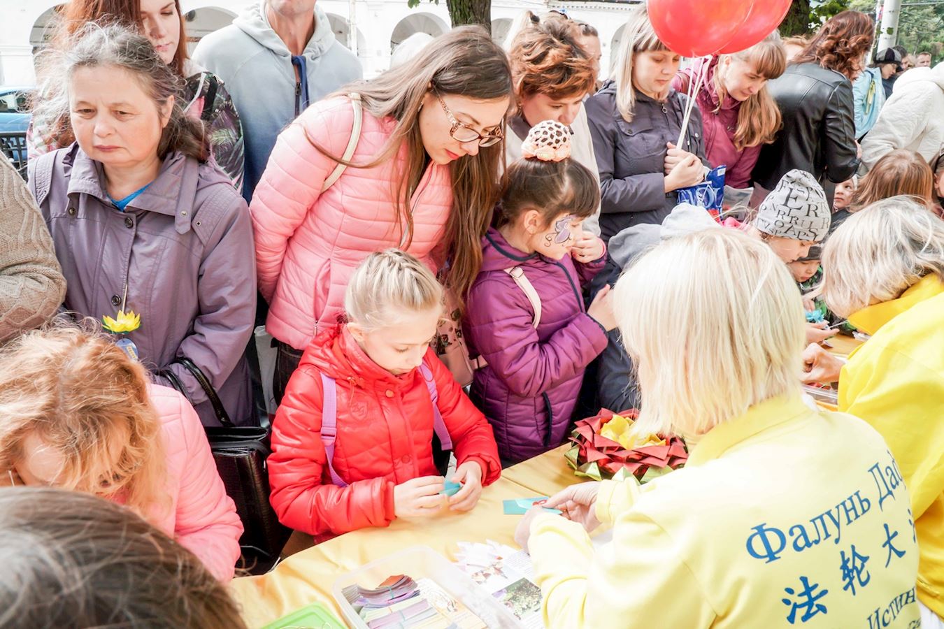 活动场地旁边设置了十张桌子,现场教人们学习制作小莲花,并告诉人们,在中国,执政的共产党政权迫害法轮功修炼者,甚至贩卖从活着的法轮功学员身上强行摘取的器官。