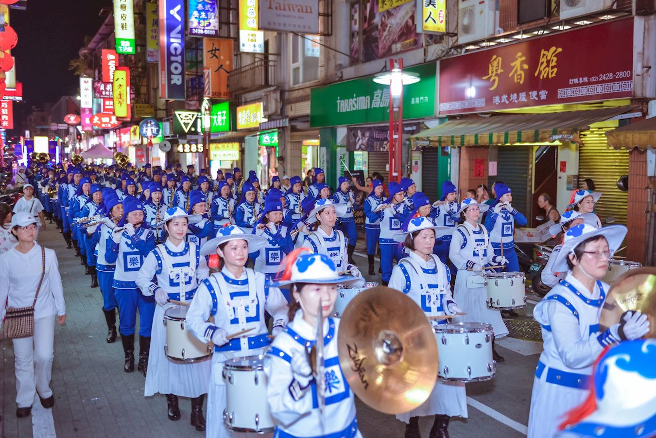 【明慧网二零一九年八月十八日】传承一百六十五年的台湾鸡笼中元祭,二零一九年八月十四日晚间,在台湾基隆市区举行大型活动,放水灯游行,各姓氏宗亲会的主题花车、灯车及游行团队盛大登场,台湾总统蔡英文与基隆市长林右昌共同为放水灯游行揭开序幕。众多的游行队伍中,以台湾法轮大法学会制作的大型精美花车、天国乐团、腰鼓队及仙女队所组成的游行队伍,最受欢迎,依然是群众注目的焦点。法轮大法队伍通过观礼台时,台上主持人说:“每年法轮大法、天国乐团都是最庞大的游行队伍,给基隆市增添了许多精彩。”