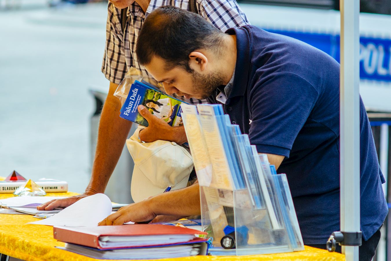 商人阿尔玛斯(Almas)看到法轮功学员信息日活动之后,马上跟同行的伙伴说,我要去签名声援他们。阿尔玛斯是维吾尔人,他对法轮功学员表示,法轮功学员炼功的场景给他留下很好印象。他用中文说,“如果我们沉默的话,那是我们自己的责任。中共做得不好,欺负人民,香港的情况也一样,人民很可怜,维吾尔族人大概有两千万人被关进洗脑班,中共要把人的思想全部更换。”他得知法轮功学员修炼真、善、忍,要做一个好人,中共迫害这些学员。他说:“中共不希望失去权利,它利用一切办法和权利限制所有的团体,不管这个团体大还是小,因为它害怕。如果它的人民了解了世界上其它国家人民怎么生活的,老百姓就会站起来。”他说,“我们生活在现在这个时代,德国有句谚语——骗子的腿短,真相总会大白。”