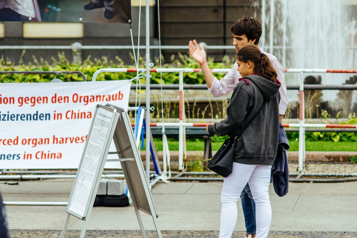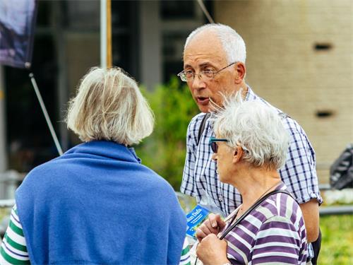 一位德国女士观看法轮功学员炼功,并告诉学员她已经了解了有关真相,知道中共迫害法轮功学员,也知道中共活摘法轮功学员器官的事。提到自己签名制止中共这种行径,她说,“我觉得这是非常严重的迫害人权,作为个人我不知道能为此做些什么。”她觉得签名只是能为此做的最小的一件事情。这位女士觉得法轮功学员炼功场景吸引了她,“他们绝对是和平的。”对于修炼真、善、忍的法轮功学员在中国遭受迫害,她说,“这是愚蠢的,十分无知,人类本性深层的无知,干这事儿的人不知道他自己是谁。”