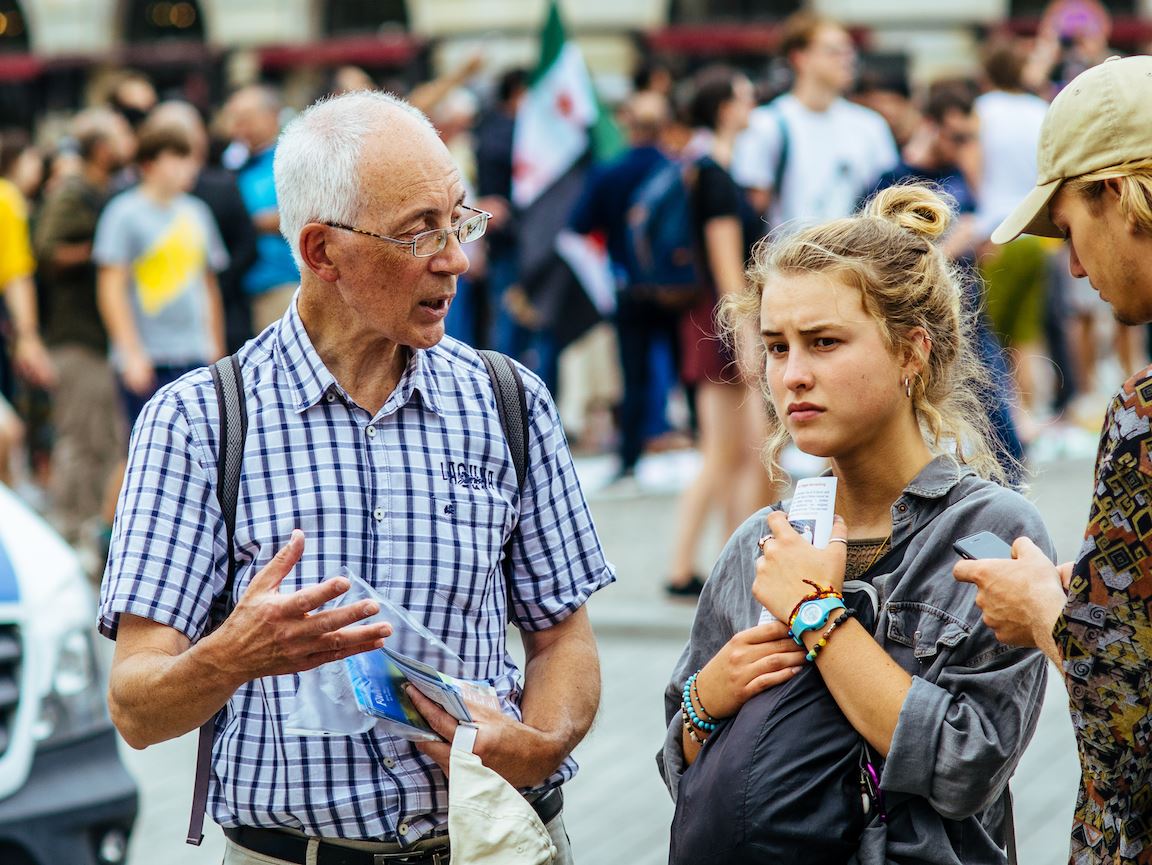 ![]() 图8~9:法轮功学员和过往民众交谈,传播真相 |