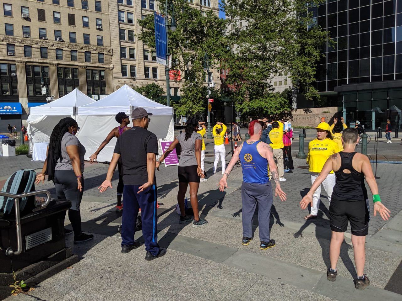 【明慧网二零一九年八月二十二日】“夏季街市”(Summer Streets)是纽约市民一年一度的夏季重要活动。市交通局每年在八月连续三个星期六,开放近七英里的街道,封街供人们进行各种免费活动。二零一九年八月,法轮大法团体第一次受邀请,在纽约市政府(City Hall)所在地弗利广场(Foley Square)教授民众法轮功功法。
