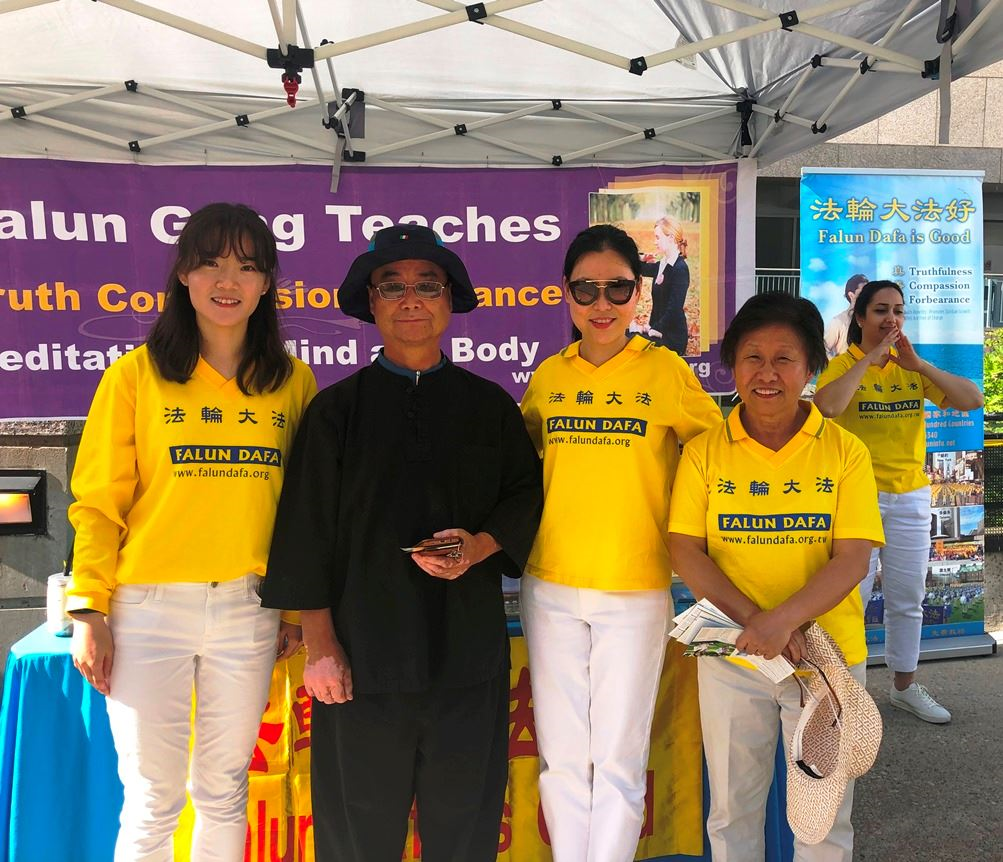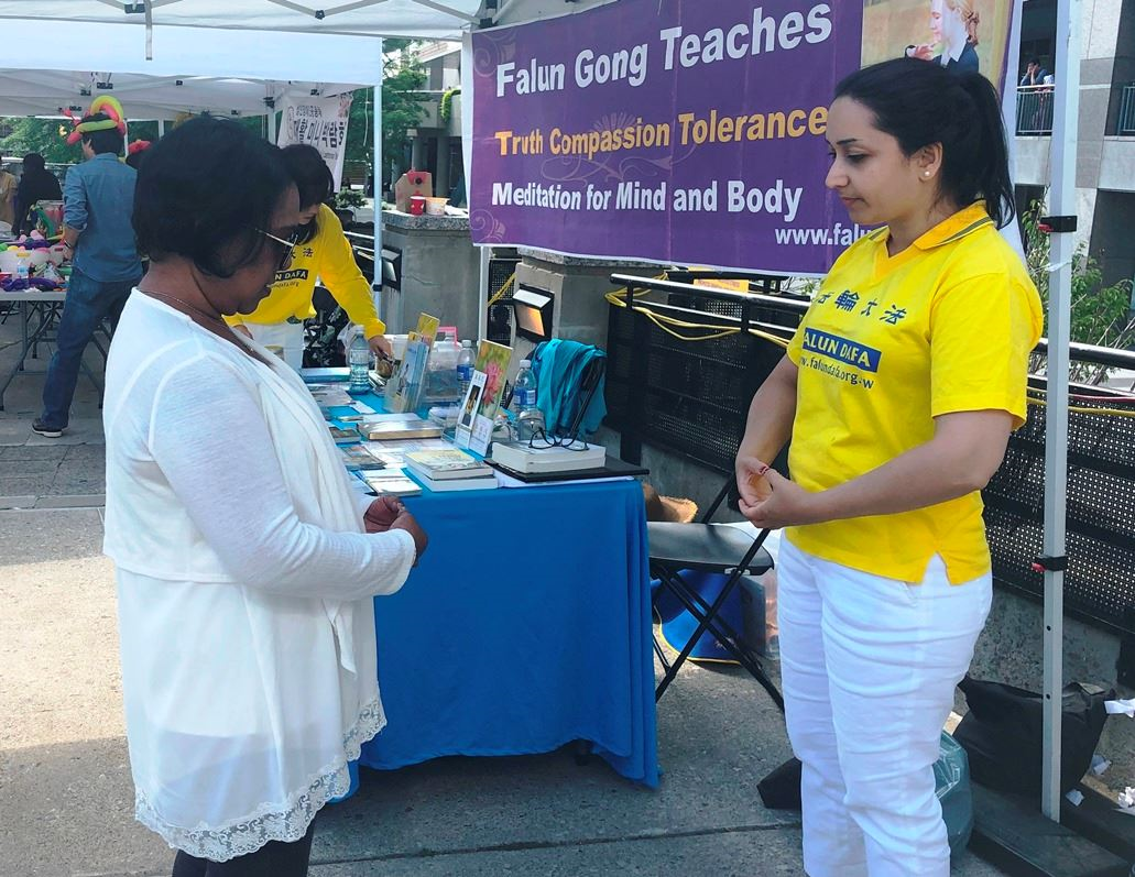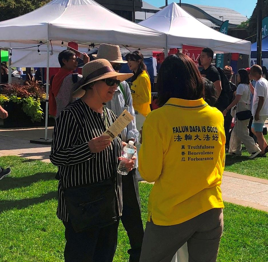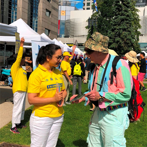 一对移民加拿大七、八年的大陆老夫妇走到法轮大法展位前想要获得炼功点的信息。太太询问学员说:“我想要知道在哪里学功,我们家附近有没有炼功点?我听说这个(法轮大法)效果特别好。”