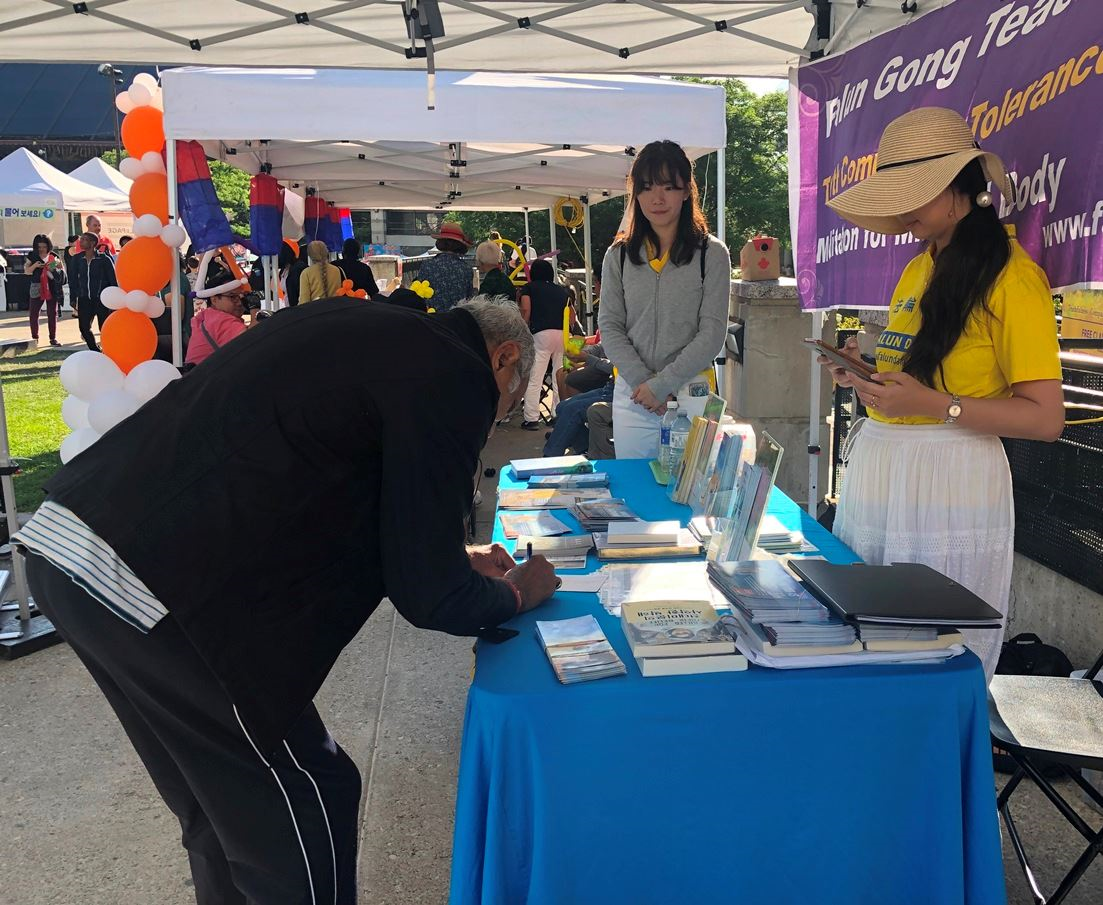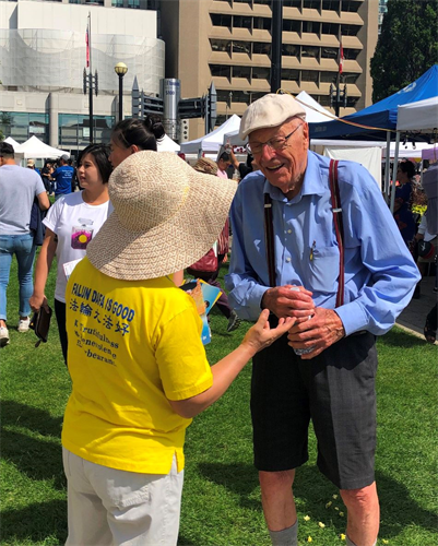 一位从印度来加拿大旅行的老先生走到展位前说:“我知道法轮大法,我在印度就听说了这一切,我能为你们做点什么?”在签过给加拿大政府的呼吁帮助制止迫害的明信片后,他表示,非常高兴能有机会为法轮大法以及在中国遭受迫害的法轮功学员尽一份心力。