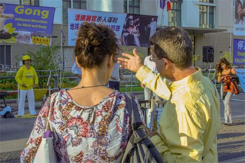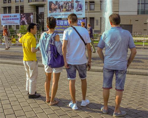 【明慧网二零一九年八月二十六日】二零一九年八月二十四日周六,柏林法轮功学员在市中心搭起真相点,向民众介绍功法,并讲述中共对法轮功的迫害事实。著名的柏林爱乐乐团正好这一天也在勃兰登堡门举行一场露天音乐会,直到晚上,这个柏林的心脏地区还聚集着很多游客。法轮功学员们的真相点持续到晚上十点钟。许多人深入了解了法轮功真相,并为反迫害签了名。也有不少人对功法很感兴趣,询问哪里可以学功。