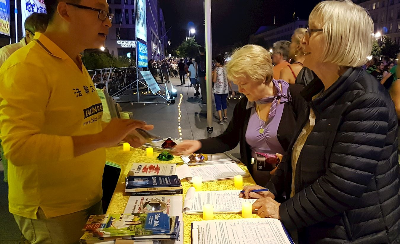 来自奥地利的教师马库斯(Markus)为反迫害签了名,并告诉学员:“我签名,因为我相信这些(真相)。”很多路人都对法轮功学员表现得很友善。一位去过东南亚的男士祝学员们一切顺利,并一定要和每个在场学员握手。