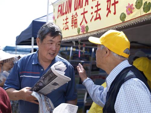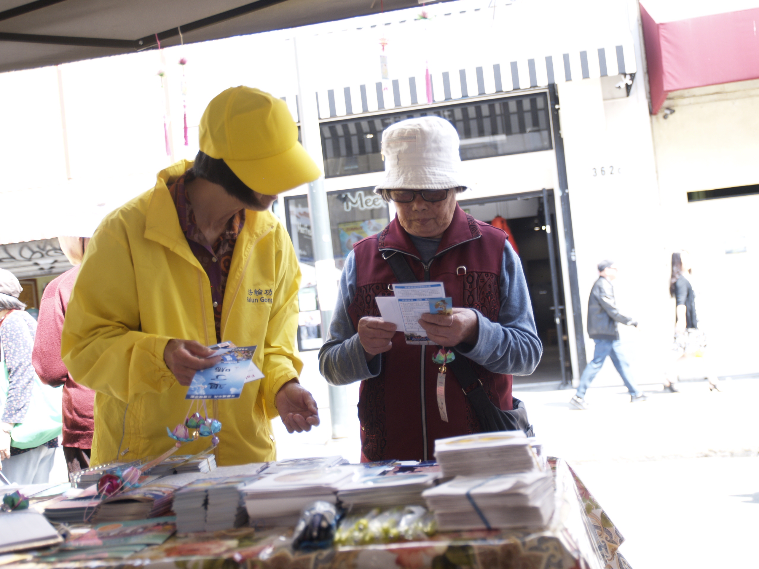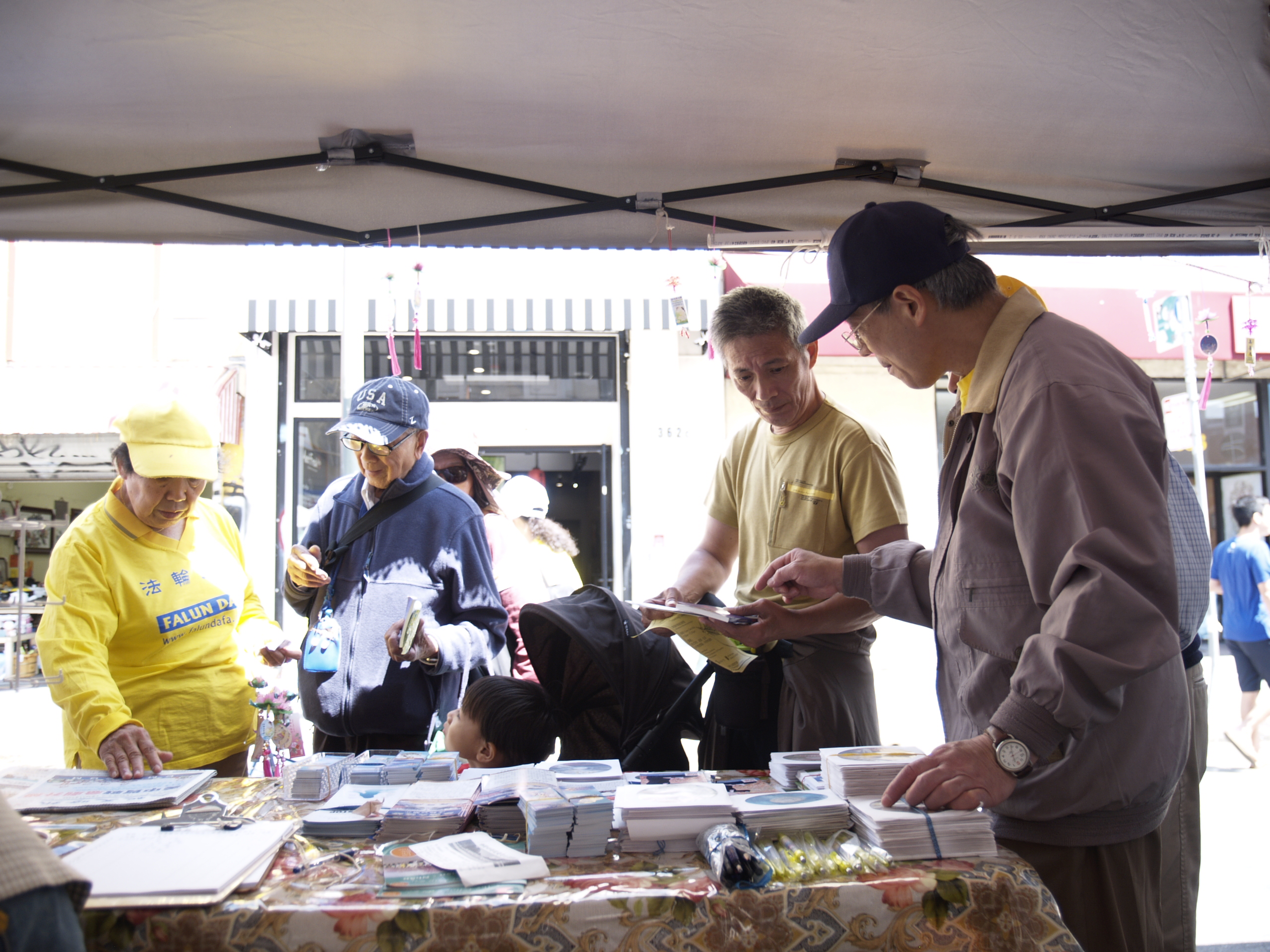 当天的奥克兰中国城车水马龙,好不热闹,法轮功学员在摊位上准备了各种介绍法轮功以及揭露中共的真相资料,还有《九评共产党》等真相资料,经过摊位了解真相的人们络绎不绝。许多华人主动了解真相,当天有一百四十多人三退(退出中共邪党及其团、队组织)