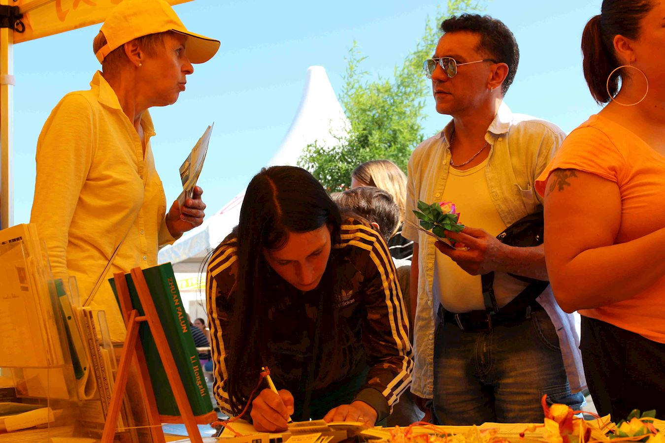 有类似观点的不只是阿曼一人。二零一九年八月二十三日至二十五日,法轮功学员再次参加了在瑞士伯尔尼举办的亚洲节。三天的活动中,法轮功学员在舞台上和设立的展位前演示五套缓慢圆的功法,将法轮大法的美好展示给大家,并向路人分发真相资料,揭露中共迫害法轮功及活摘法轮功学员器官的罪行。虽然活动当日烈日炎炎,很多路人还是驻足和学员交谈,了解详情,有的签名表示自己对法轮功学员的支持,有的询问集体炼功的时间和地点,打算去学炼法轮功。