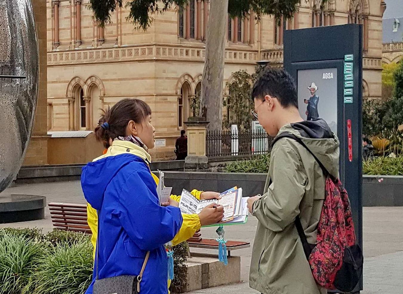 陆陆续续有一些新入学的中国留学生和家长从讲真相活动点经过,他们有的听法轮功学员讲真相,有的接过资料快速放入书包里。一个小学生旅游团从法轮功信息台经过,受中共邪党的洗脑控制,带队的人不让孩子们接真相资料,有几个孩子还是悄悄地拿了。他们在不远处等待参观阿德莱德大学,法轮功学员走过去跟带队的人讲:“能够理解你带队的责任,也请别配合中共,孩子们也有了解真相的权利。”她告诉附近的几个孩子,天安门自焚事件是中共造假的谎言。