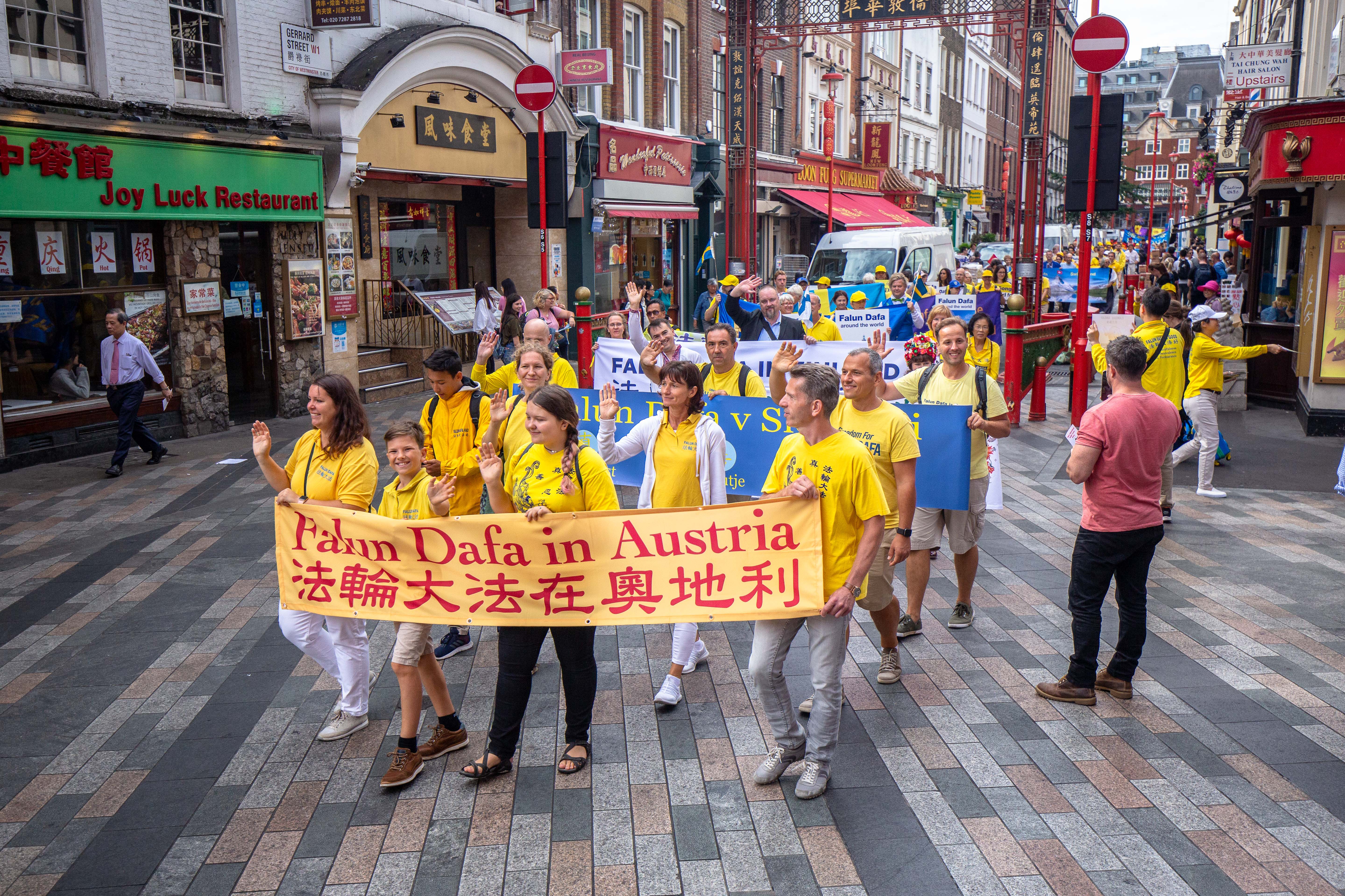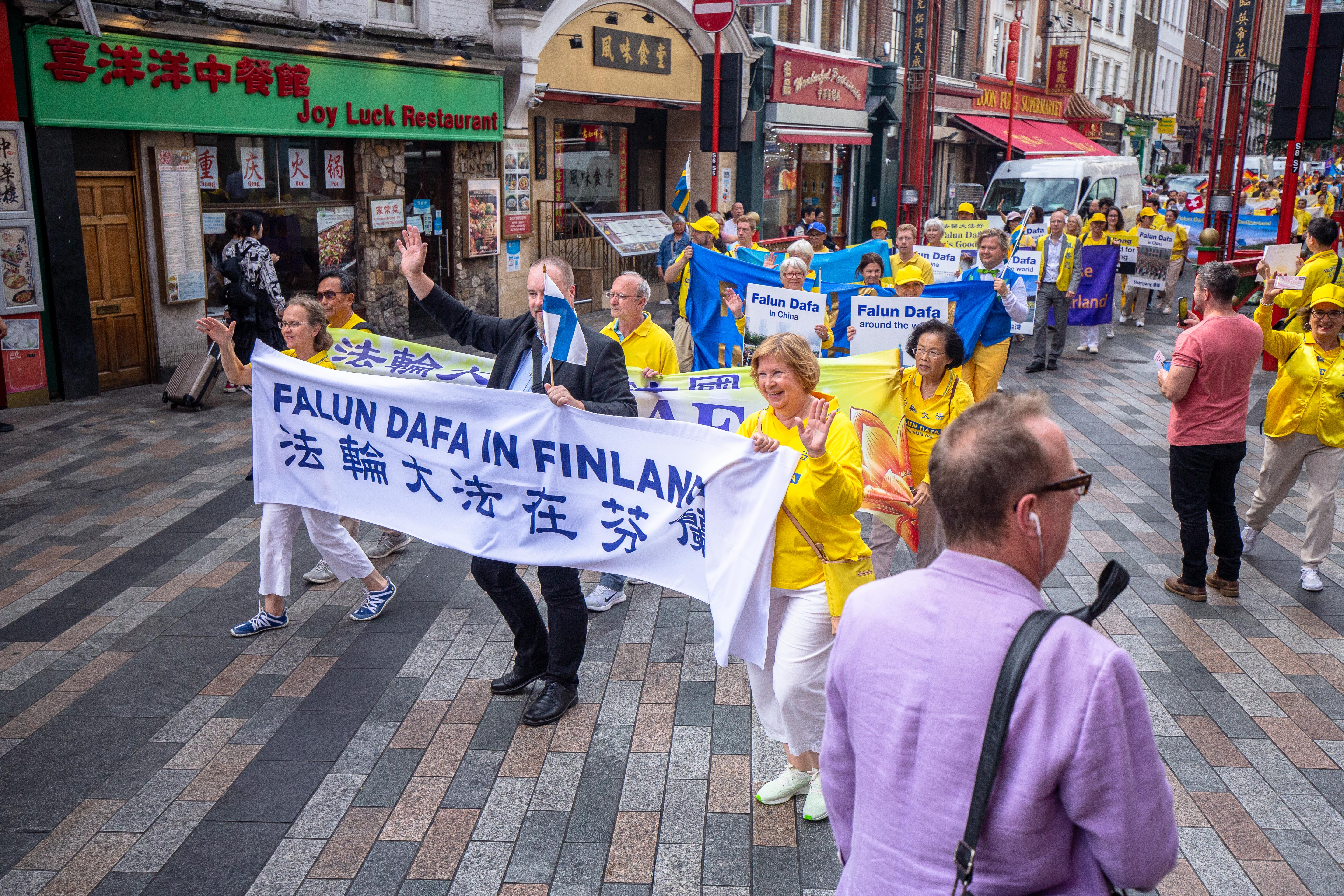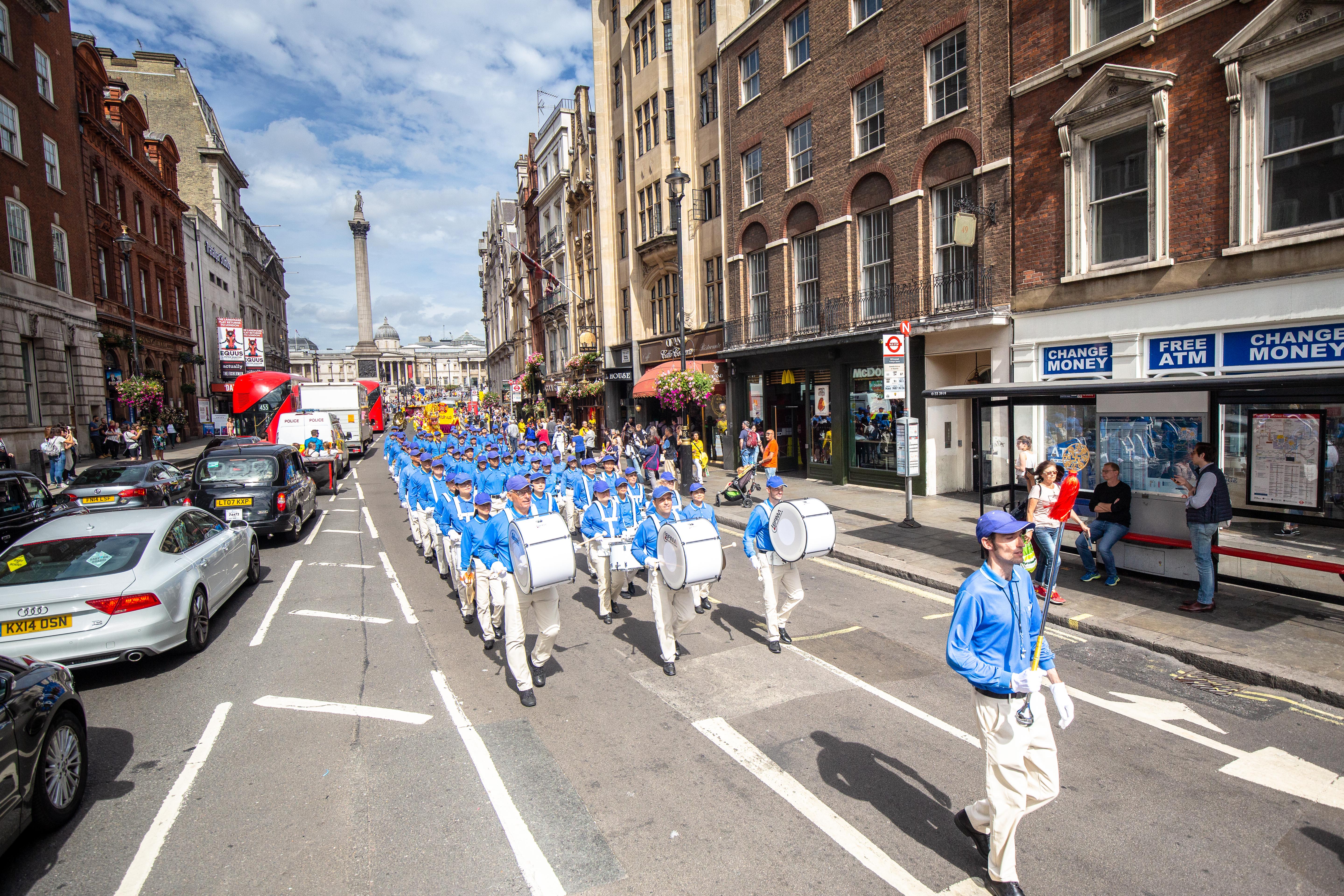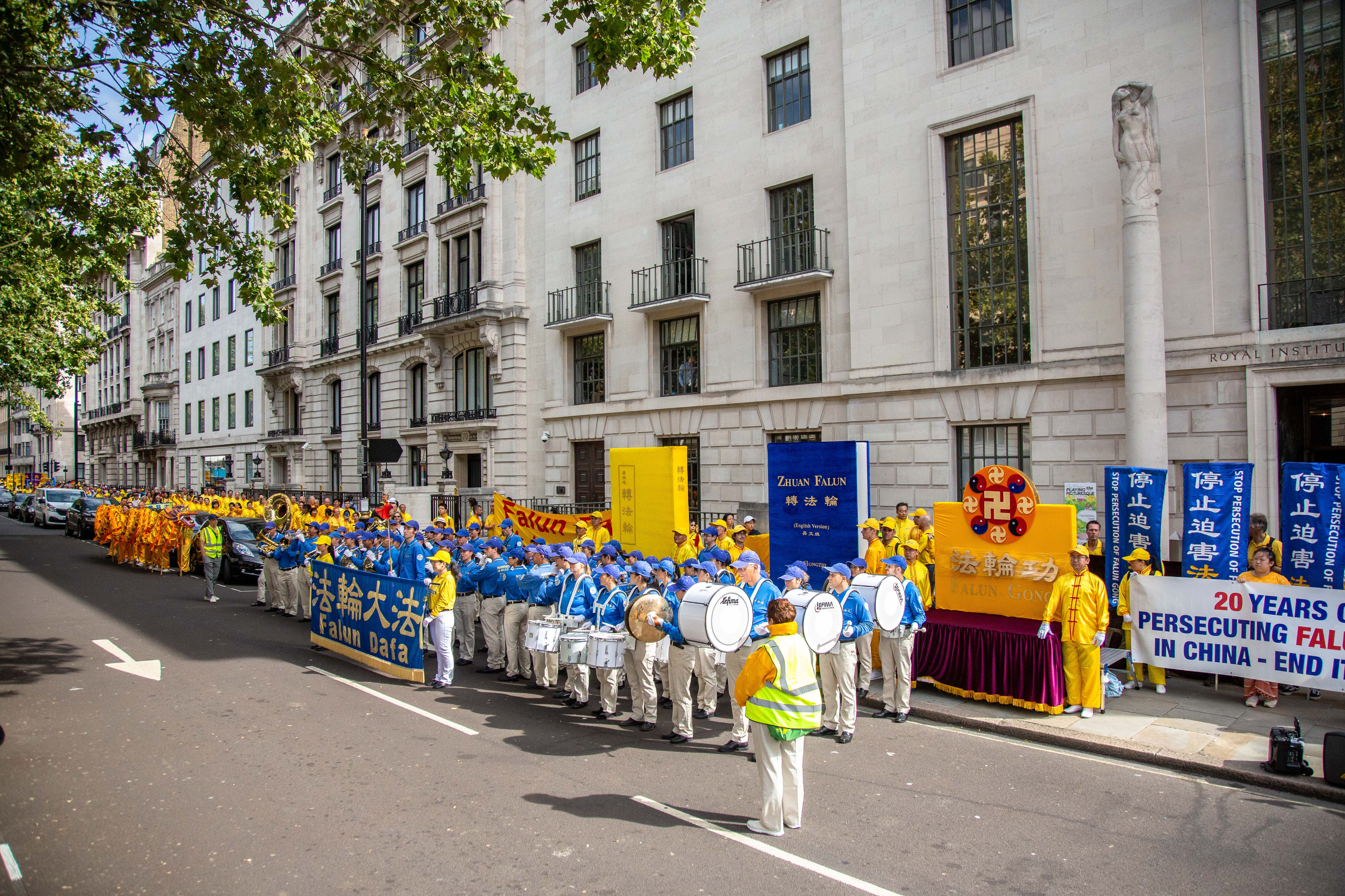 游行队伍由欧洲天国乐团开道,来自波兰和英国的两支舞龙队飞舞其中,游行的方阵包括法轮大法洪传世界、法轮大法在欧洲,法轮功功法展示,悼念被中共迫害致死大陆法轮功学员,揭露中共迫害法轮功,三退保平安等方阵,压阵的是精神抖擞的腰鼓队。
