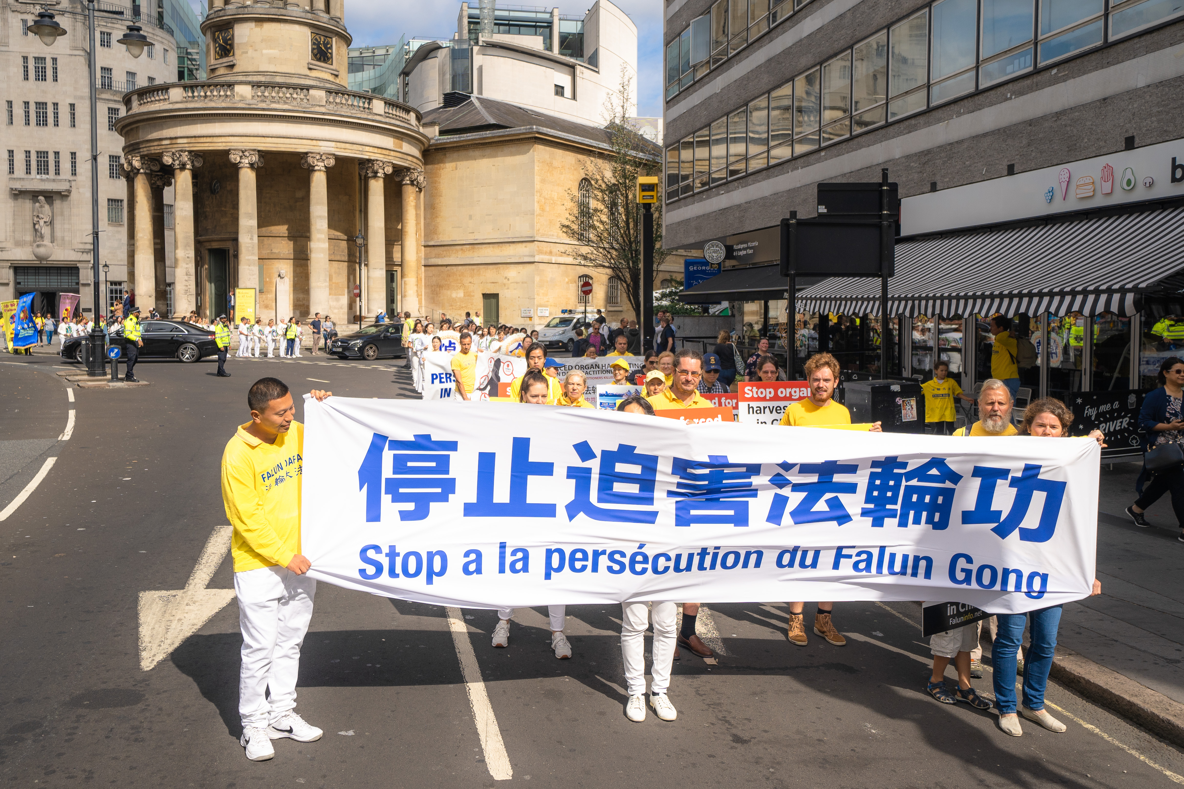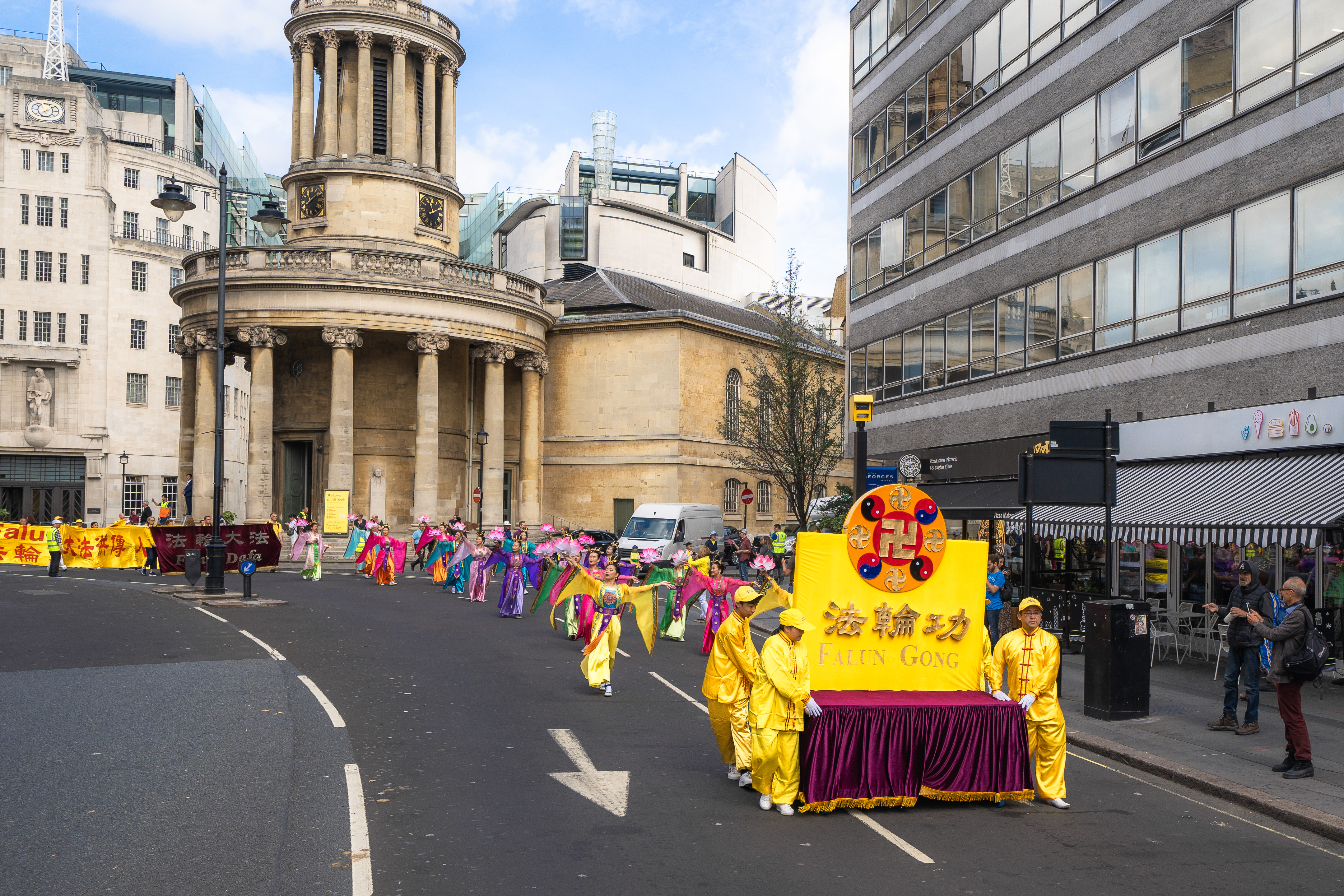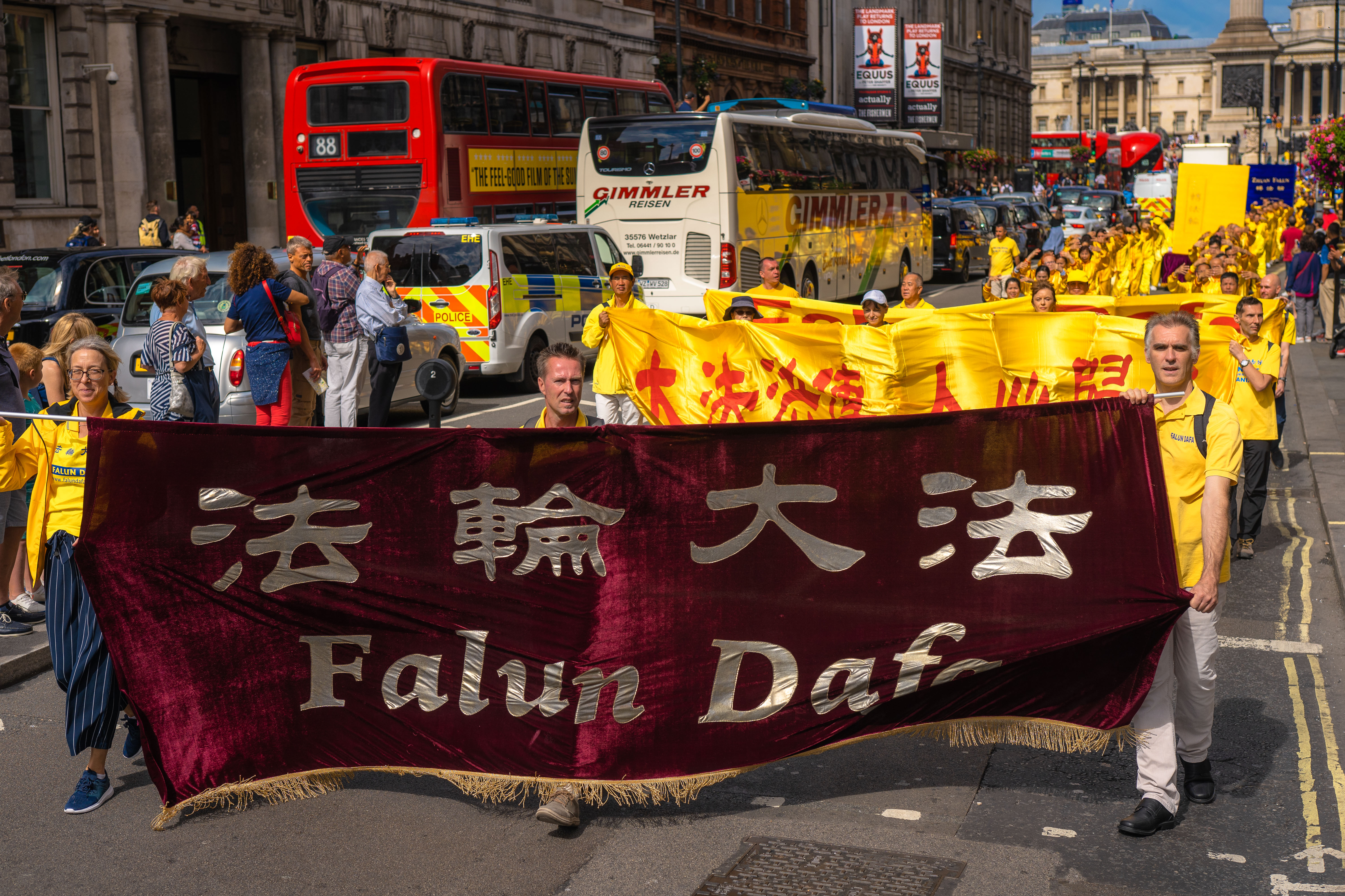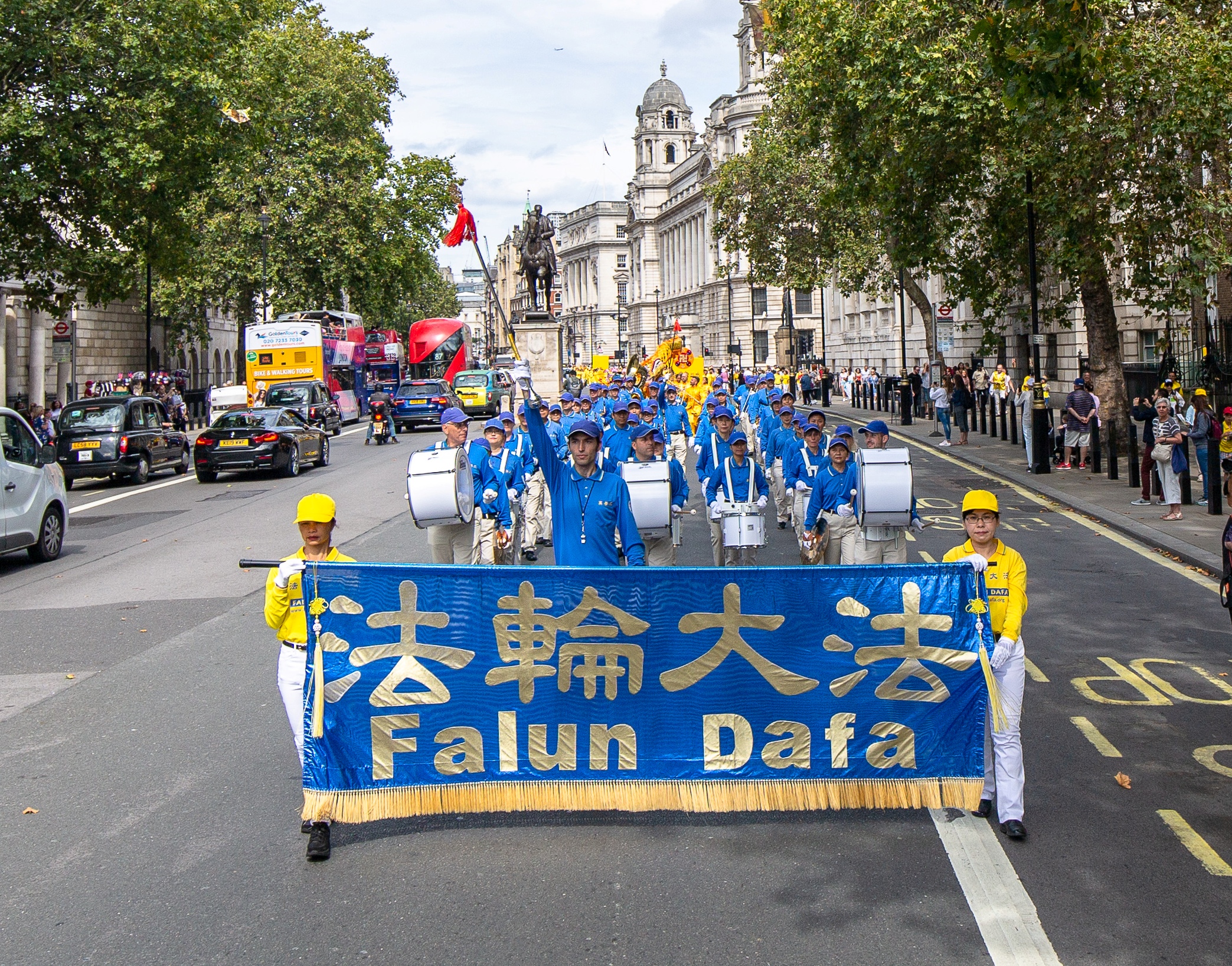 游行队伍由欧洲天国乐团开道,来自波兰和英国的两支舞龙队飞舞其中,游行的方阵包括法轮大法洪传世界、法轮大法在欧洲,法轮功功法展示,悼念被中共迫害致死大陆法轮功学员,揭露中共迫害法轮功,三退保平安等方阵,压阵的是精神抖擞的腰鼓队。