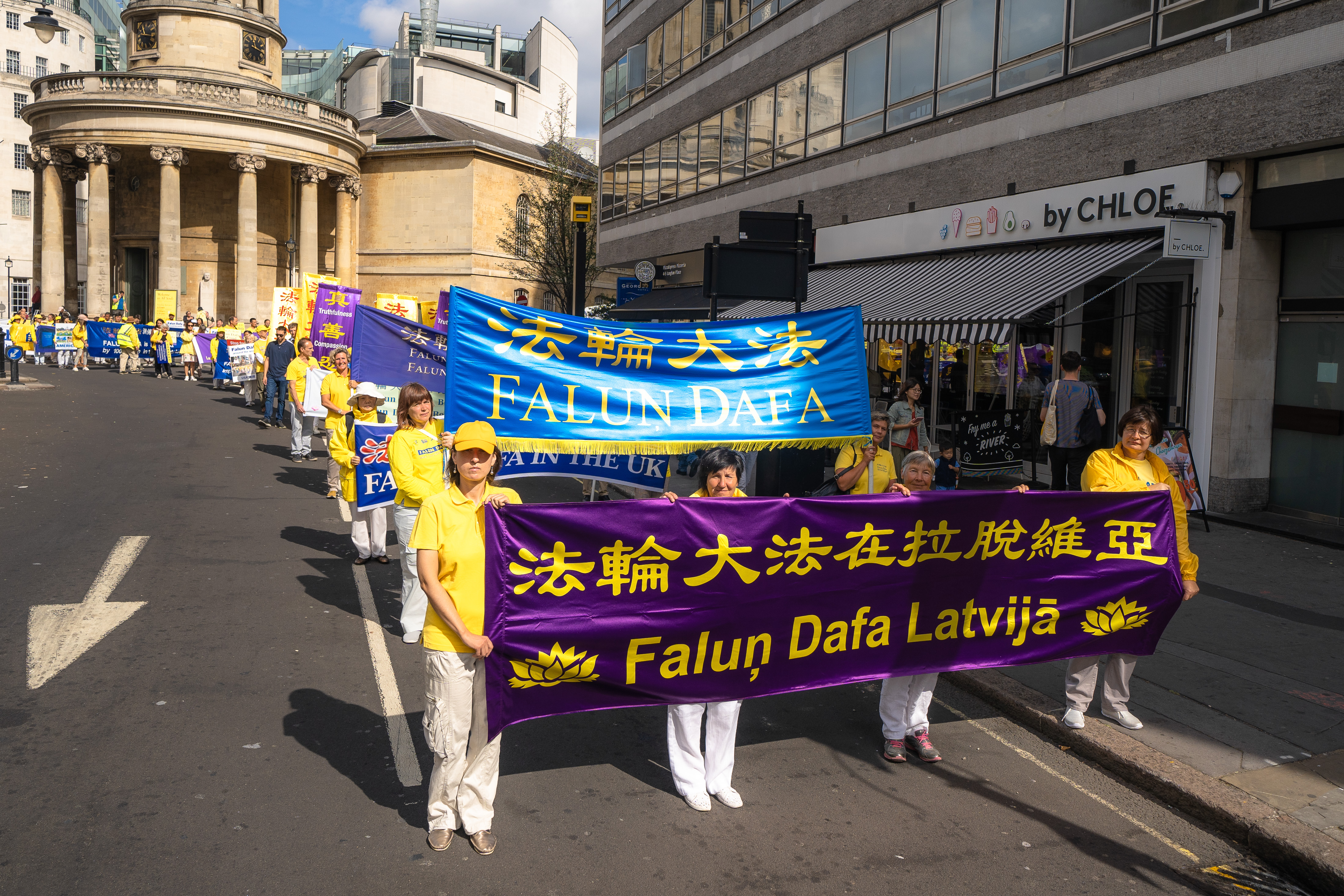 |  图1~10:来自欧洲、北美、亚洲的三十四个国家的法轮功学员聚集伦敦举办大游行,欧洲天国乐团开道。 |