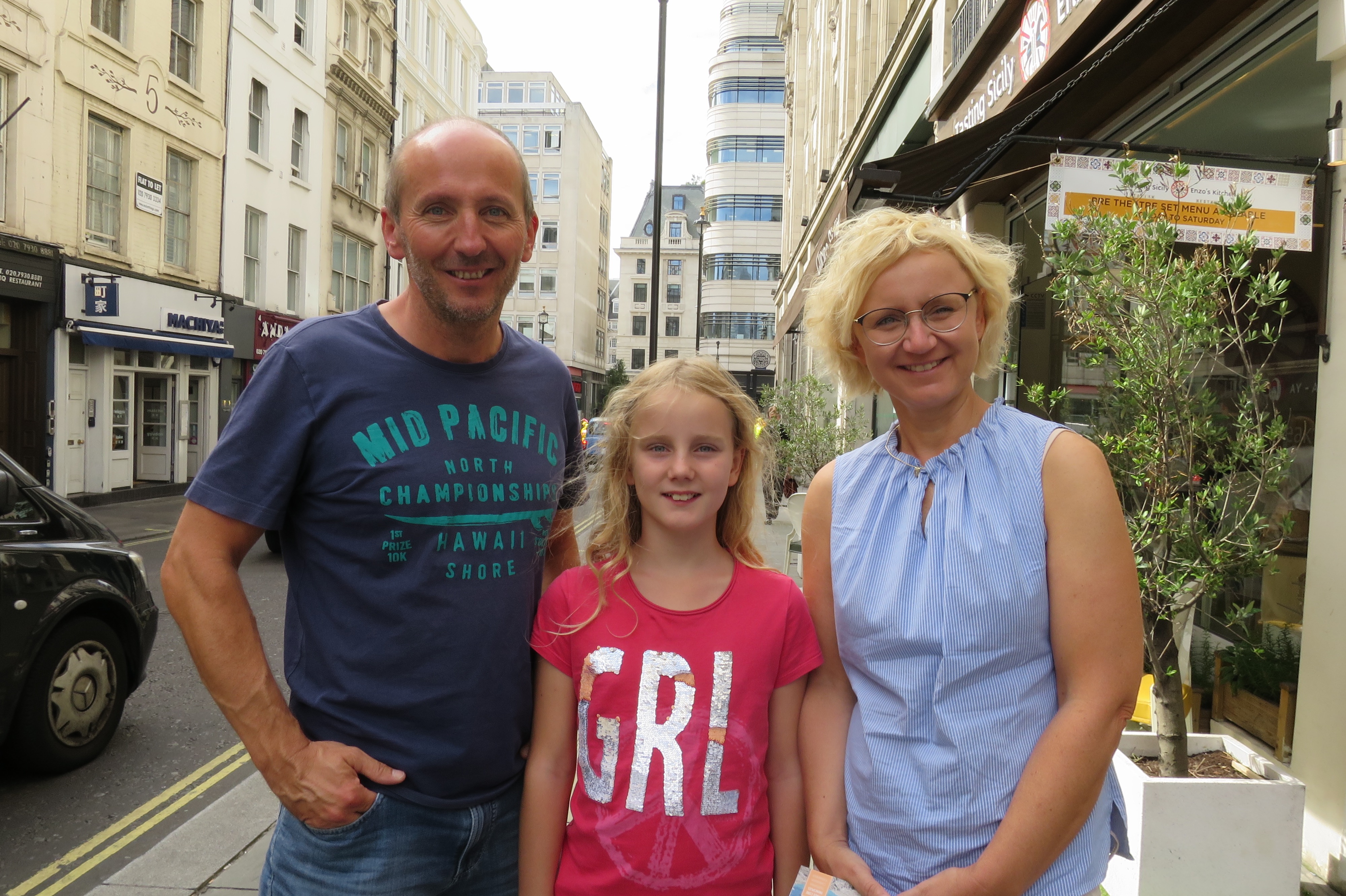 德国巴伐利亚州的库姆(Kühn)一家三口到伦敦旅游,这是他们头一次看到法轮功大游行,先生说游行队伍看上去“很友好、很和平。”太太也同意。先生还觉得游行队伍有不同的主题,感觉很有意思。他特别强调了队伍中还有讲述中共迫害法轮功和活体摘取法轮功学员器官等方面的内容,让他们感到很震惊。