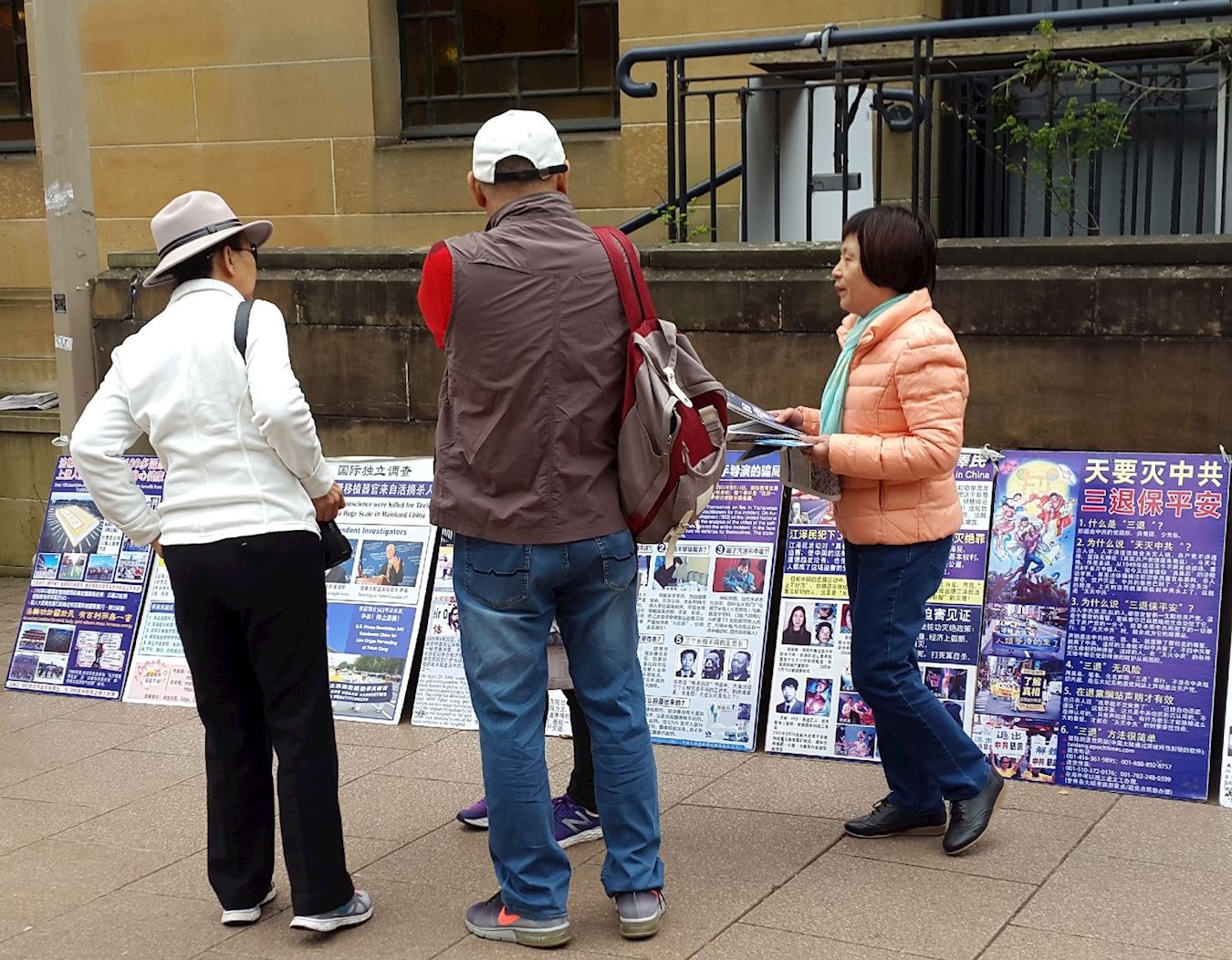 '图4:有的华人一边看展板,一边主动和法轮功学员交谈了解法轮功真相。'