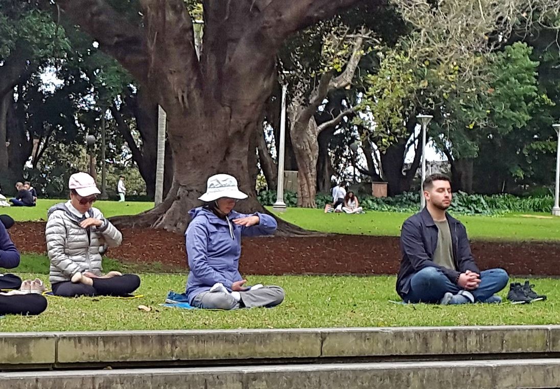 图1:法轮功学员在悉尼海德公园集体炼功,传播大法的美好。