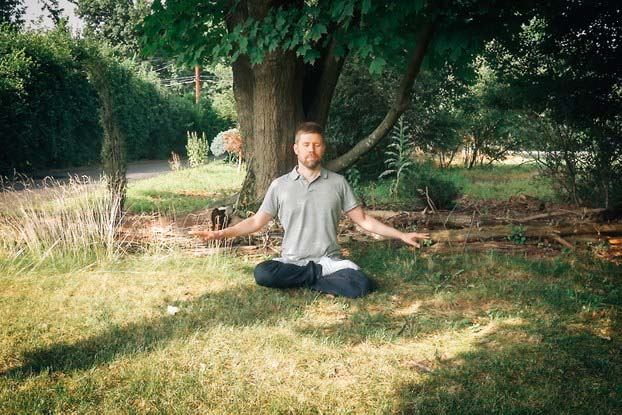 ![]() 图2:奥利近日在纽约上州的一片草坪中静坐修炼。 |