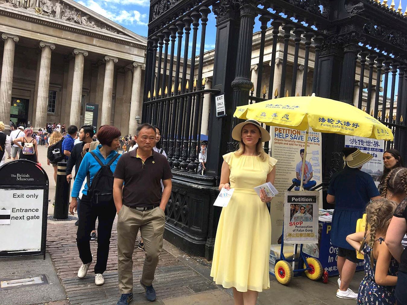 ![]() 图3:尤利娅近日在伦敦大英博物馆门外发放法轮大法资料。她还向游人介绍了法轮功学员遭到的迫害。 |