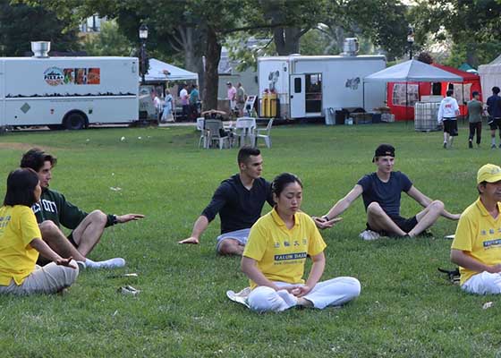 8月1日至5日在加拿大安大略省伦敦的维多利亚公园举办的节日活动中,法轮功学员设立了真相展位,不少游客看到炼功场景表示想学炼功法。