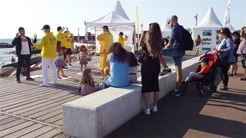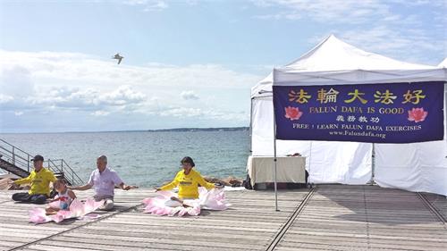 活动期间,不断有游客驻足观看,有的拍照,有的念横幅上的Falun Dafa is Good(法轮大法好),有的干脆在附近坐下,边休息边看,有的询问在哪里可以学炼功法,有的远远的自己跟着法轮功学员的动作炼。活动第二天,城市活动这一项目的负责人路过法轮大法学员的摊位,说非常高兴每年有法轮功学员的参与并感谢学员们把一切都安排的这么好。