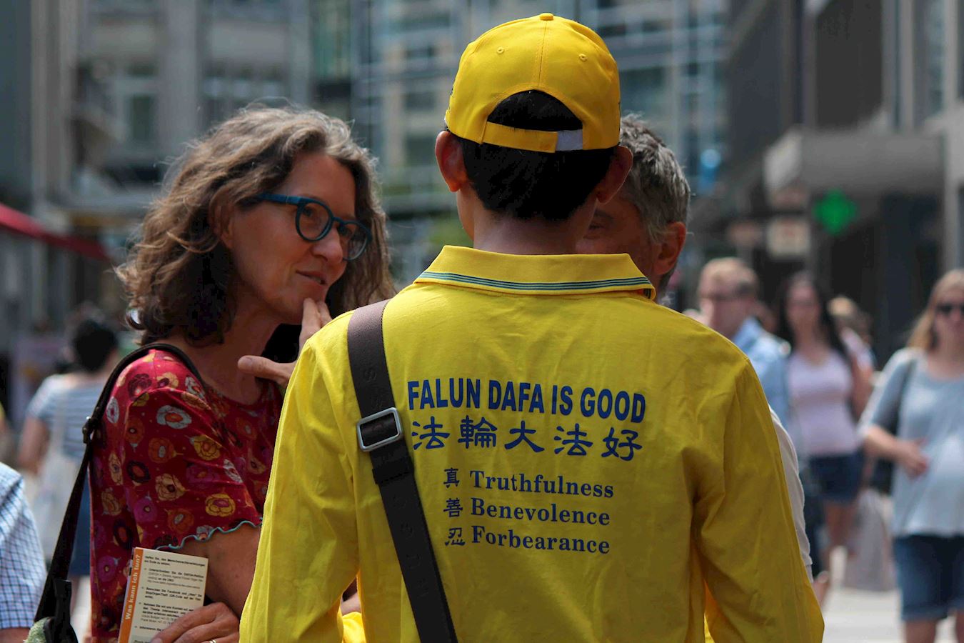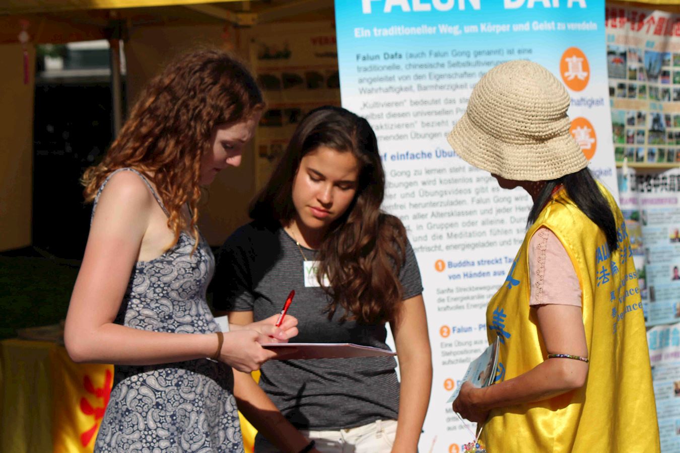 在当天的活动中,法轮功学员设立的展位成了一道特殊的景观,吸引了很多路人。有的路人还未走近,就被学员在闹市中安静祥和的功法演示所吸引;有的驻足观看法轮大法弘传世界各地的照片;还有的则惊讶地看着揭露中共活摘器官罪行的展板……有的在学员和他们短暂的交谈后就签名要求制止迫害法轮功;有的和学员长时间交谈,了解更多的讯息;有的在得知有不同诉求的征签表时,爽快地说,我都签!还有的询问炼功点的时间、地点,打算去学炼功法……