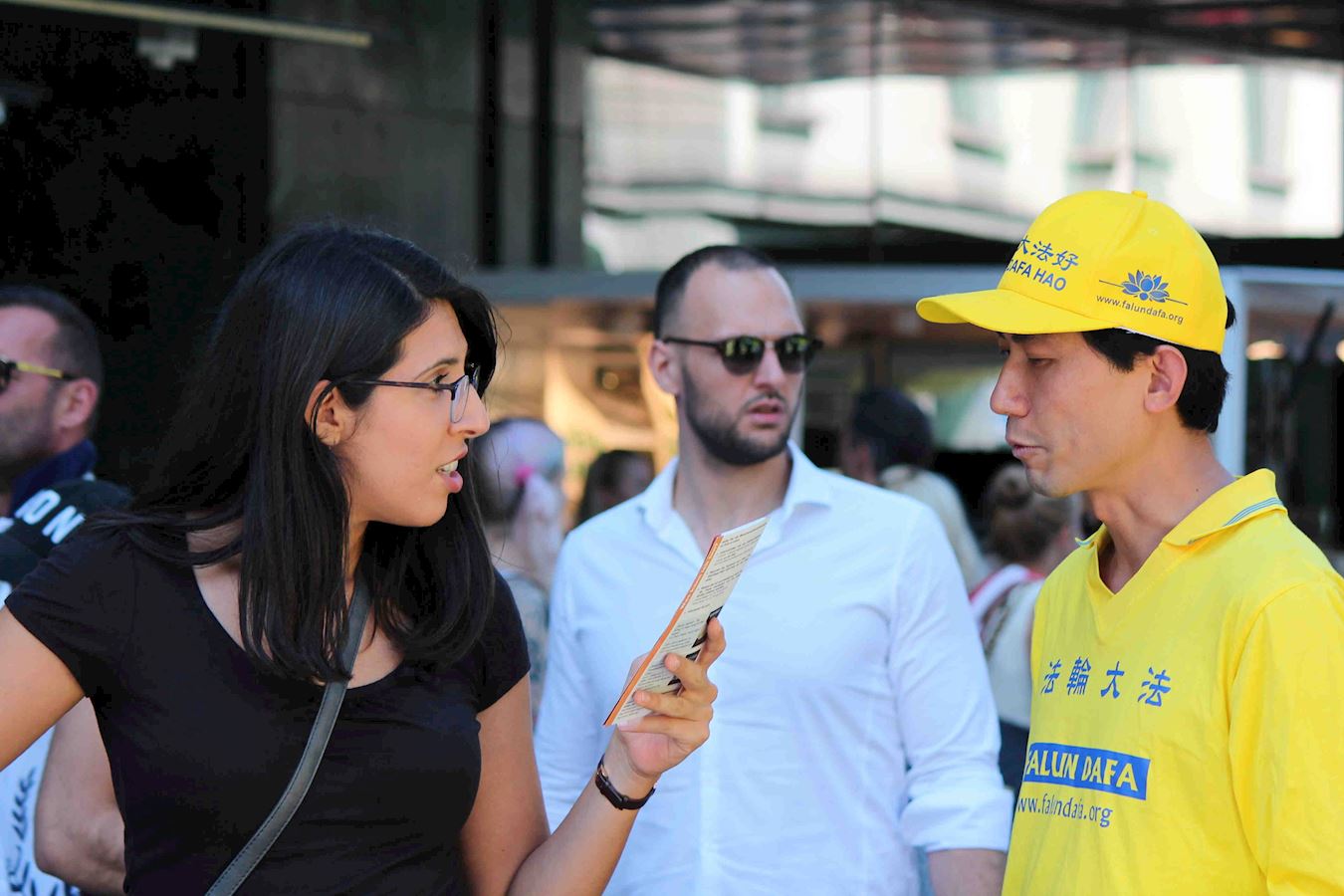 二零一九年八月三日,瑞士法轮功学员来到苏黎世市中心举办活动,向民众展示五套缓慢圆的功法,发送真相资料,介绍法轮功,揭露中共二十年来对法轮功学员的血腥迫害,特别是中共活摘器官的罪行,并向路人征集反迫害签名。