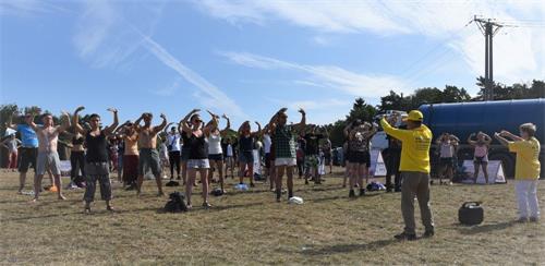 一位小伙子急匆匆赶来询问;“是法轮大法吗?我可找到你们了,我想学炼法轮功,什么时间开始教(功)啊?”得知展位上的帐篷需要加固时,他立即找来几个朋友热心帮忙。当法轮大法炼功音乐在空中响起时,现场已聚集了很多的人,大家纷纷放下手中的啤酒,随着音乐一个动作一个动作认真学起来。